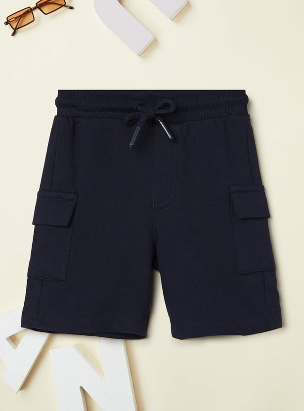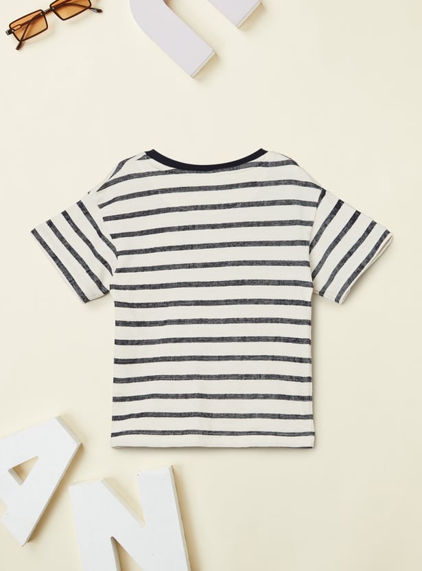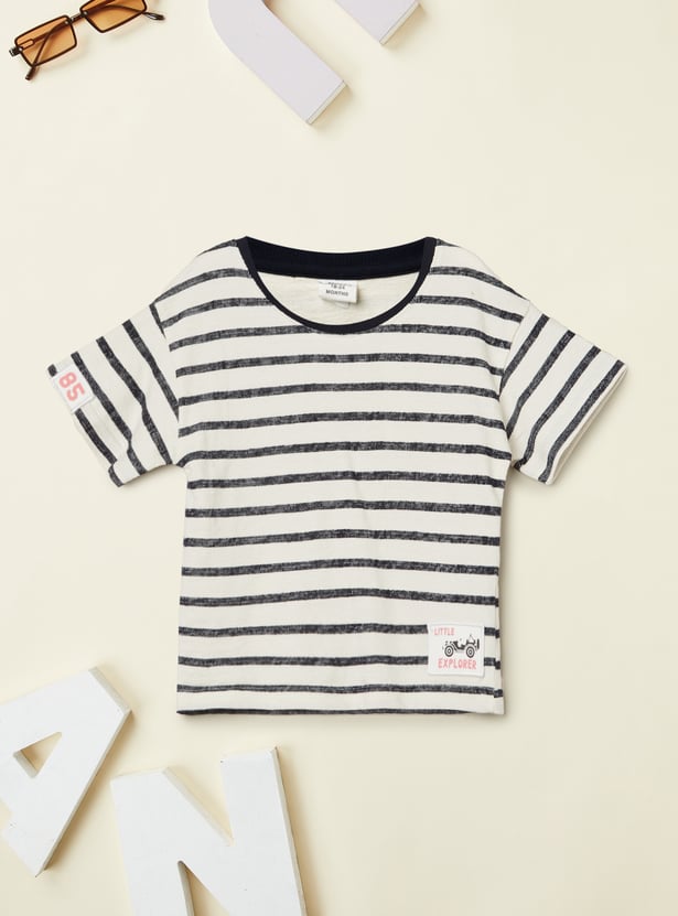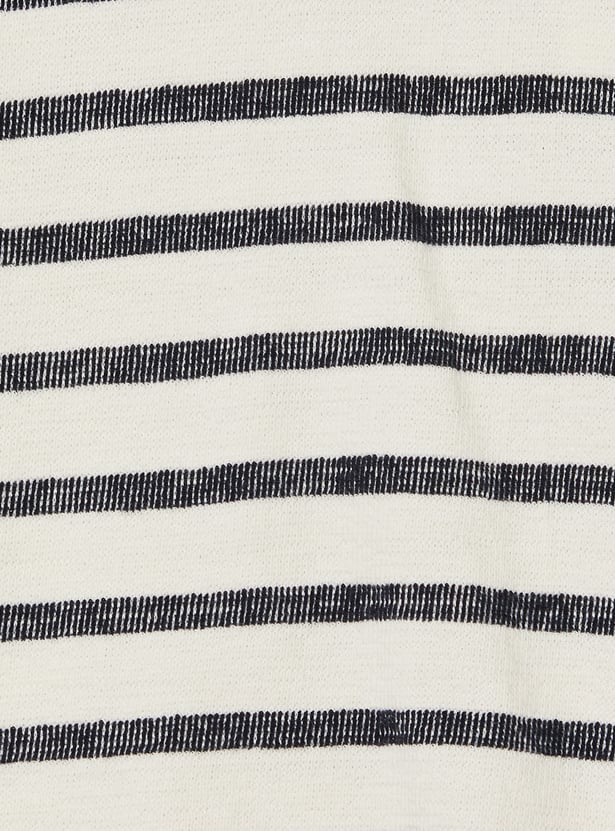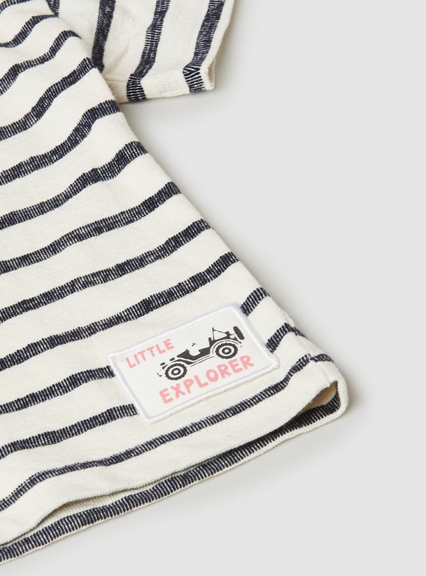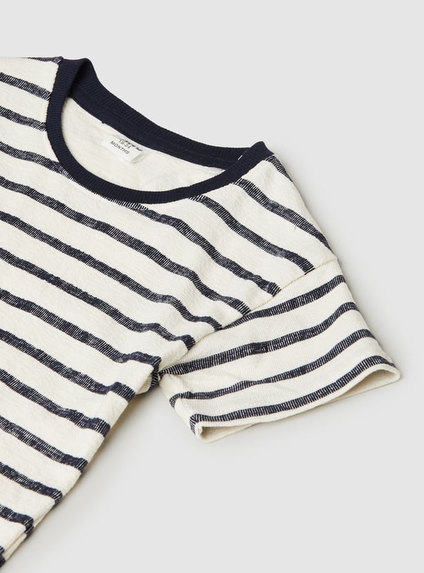 This striped shorts set pairs a classic crew neck, half-sleeve shirt with matching shorts featuring a mid-rise, drawstring closure and handy pockets.