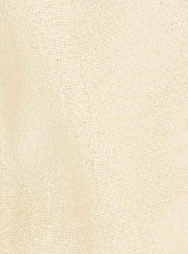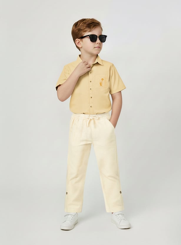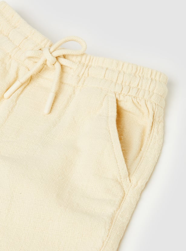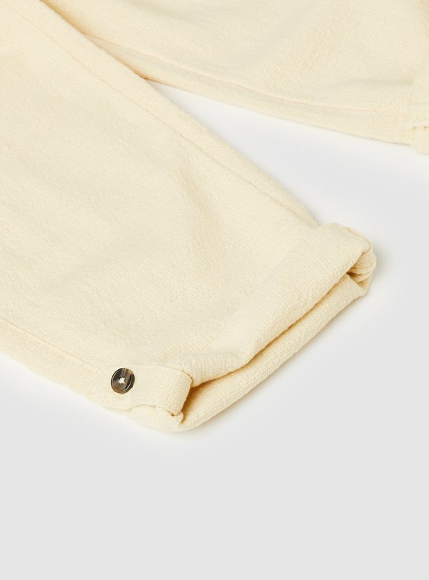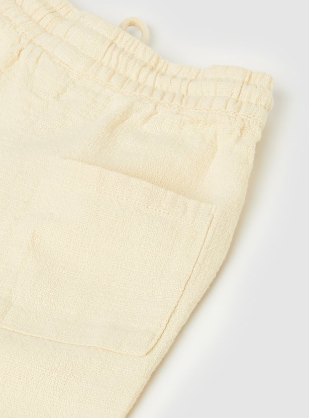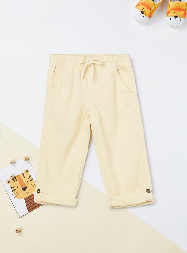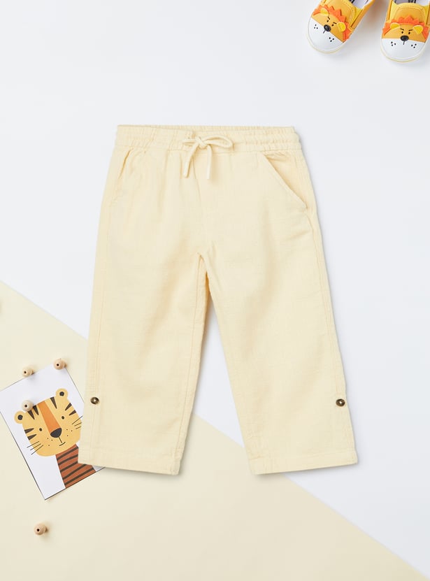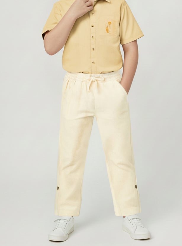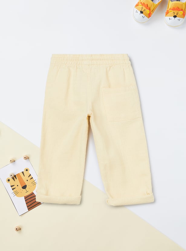 Effortlessly blend style and comfort with these textured regular fit trousers, featuring a mid-rise, drawstring closure, practical pockets, and fold tabs at the hem for a contemporary touch.