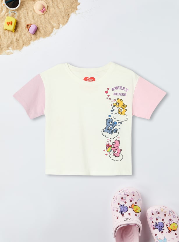 Refresh your little girl's casual look with this t-shirt. It has a round neck, half sleeves with a colourblock design, and a cute Care Bear graphic print at the front.