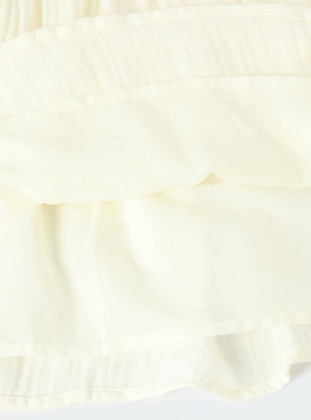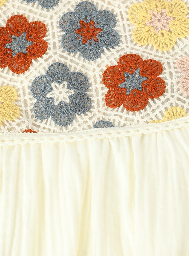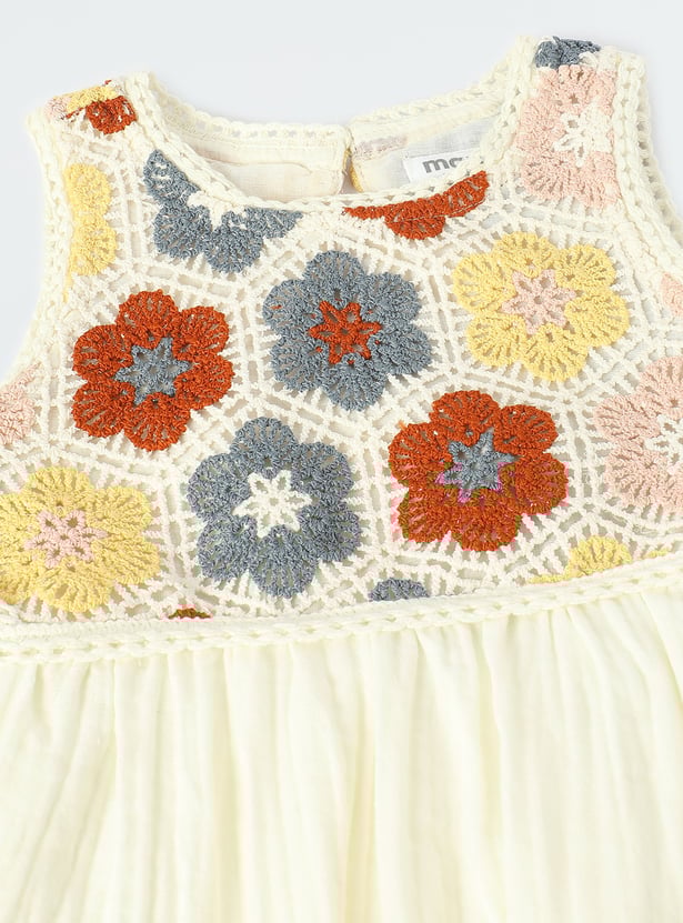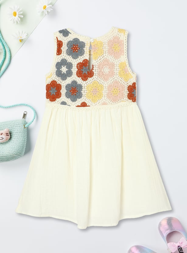 Elevate her style with this charming dress. Featuring a round neck and sleeveless design, it boasts a beautifully detailed crochet bodice. The button closure at the back ensures a secure fit, while the lining provides comfort and a perfect fit. Ideal for special occasions or anytime she wants to shine.