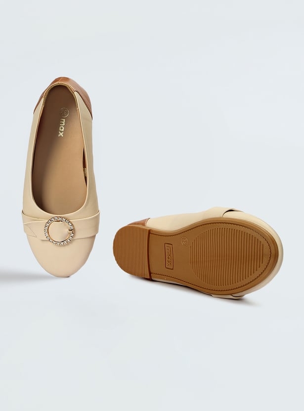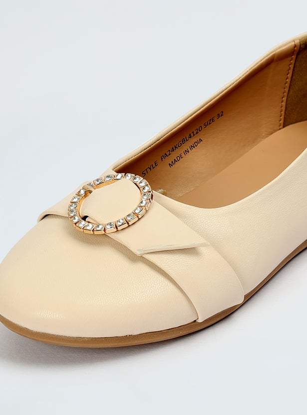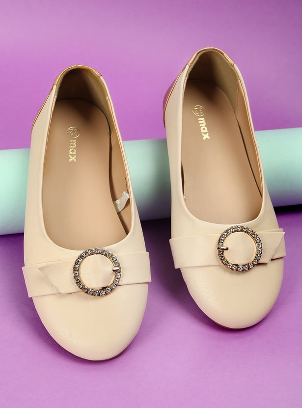 A classic choice for your little diva, these ballerinas with a sleek patent finish effortlessly complement both casual and dressy outfits. Designed with a round toe and embellished buckle detail at the vamp, they feature a comfortable footbed and a durable outsole for all-day ease.