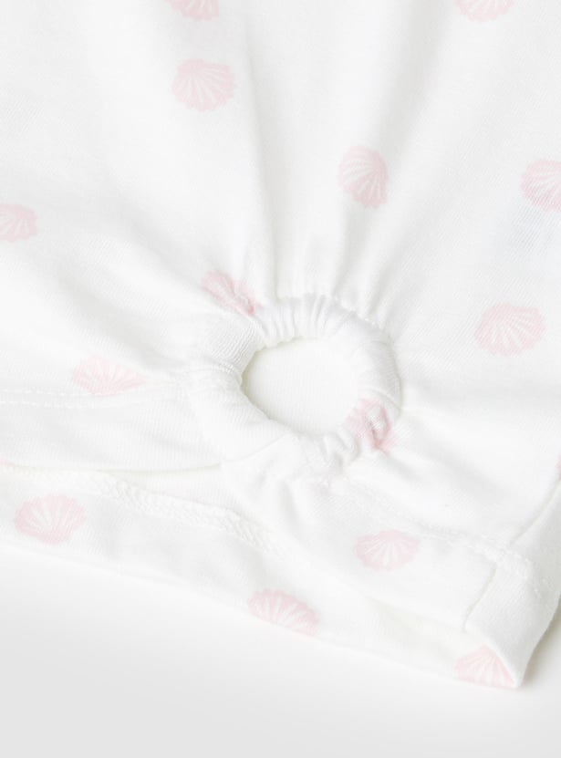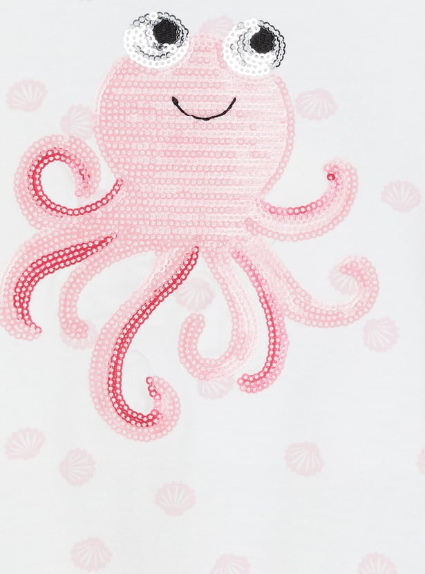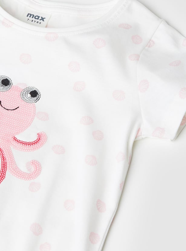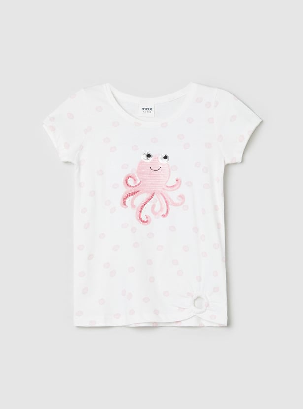 Jazz up her casual day looks with this T-shirt. It features a round neck, short sleeves, embellished octopus detail, an all-over print, and a cut-out at the hem.