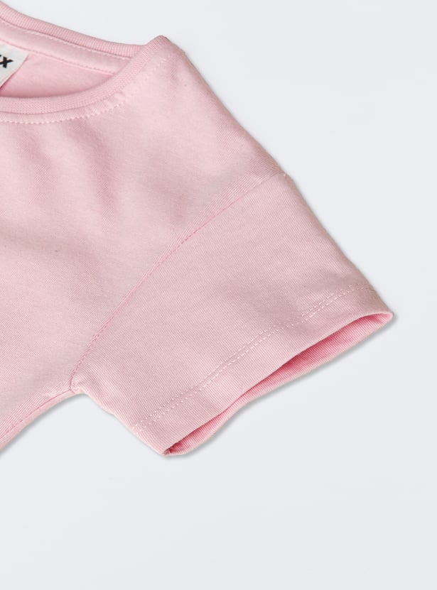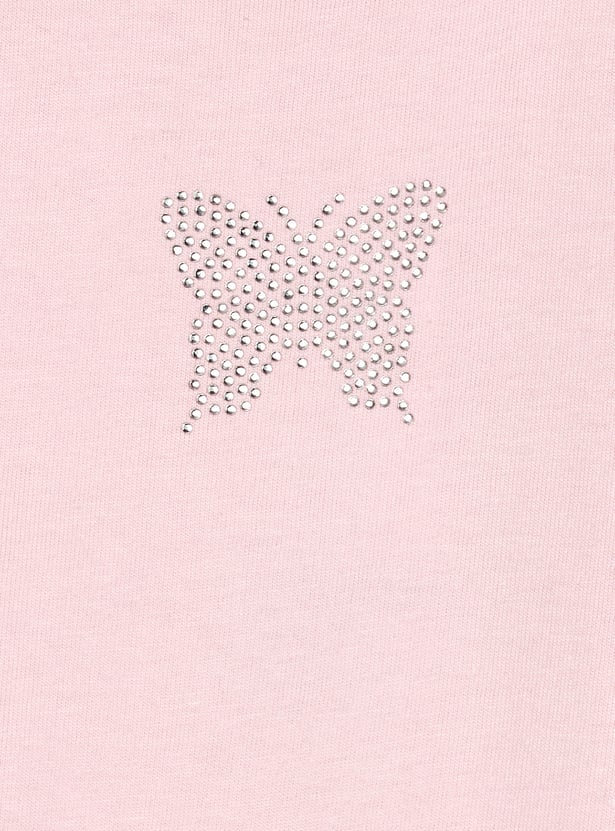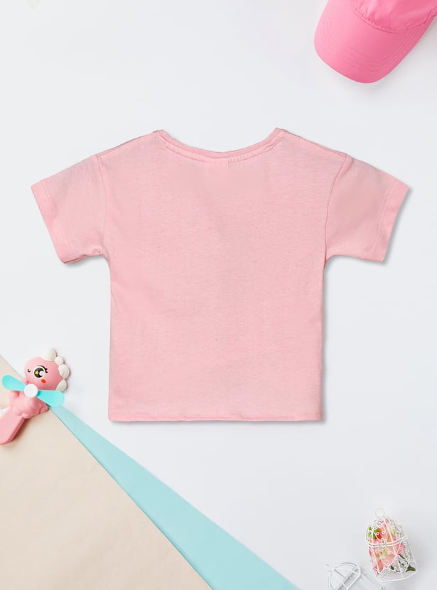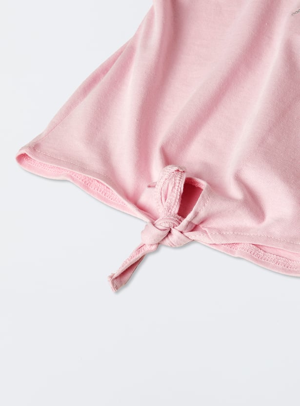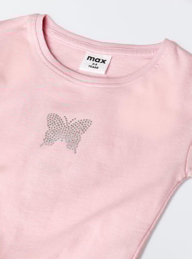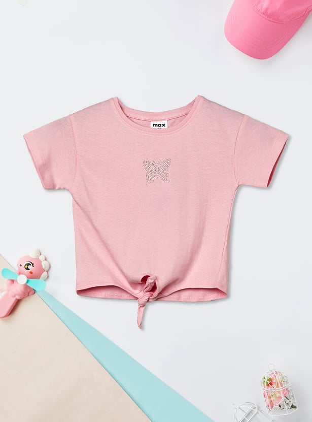 Add some charm to your little one's wardrobe with this embellished t-shirt! Featuring half sleeves, a round neck, tie-up hem, and a cute teddy embellishment on the front, it's a playful and stylish choice for everyday wear.