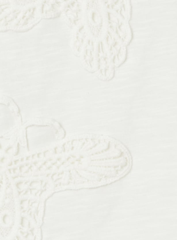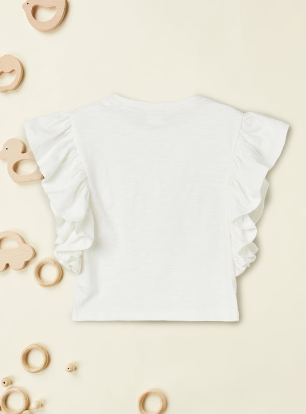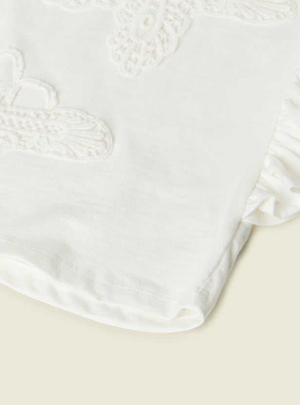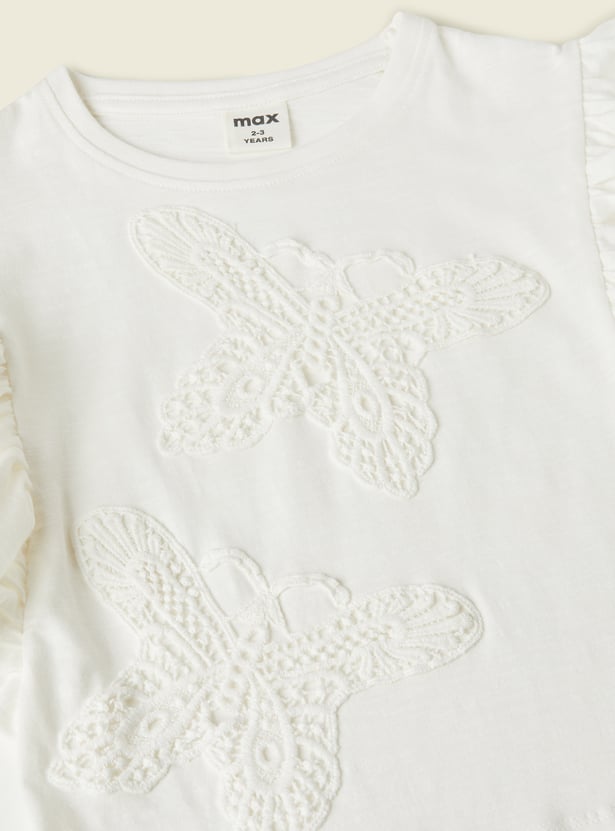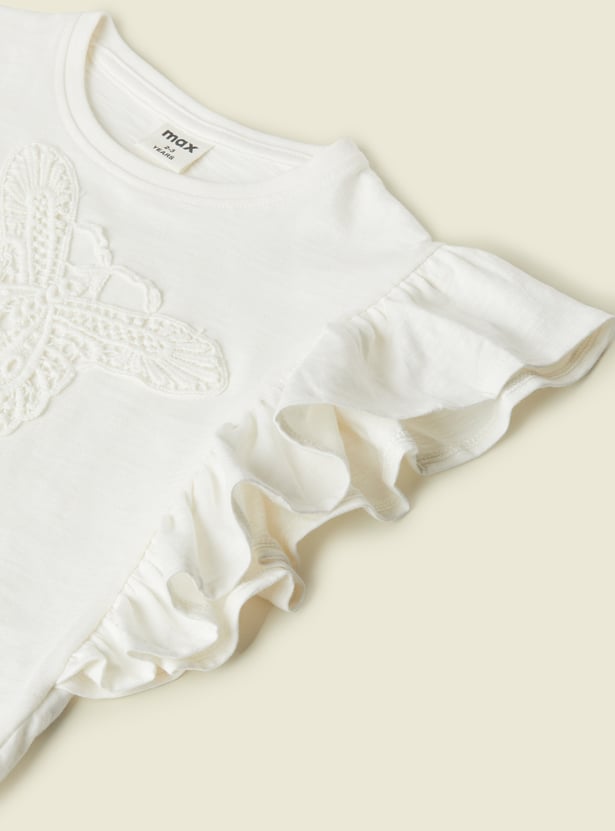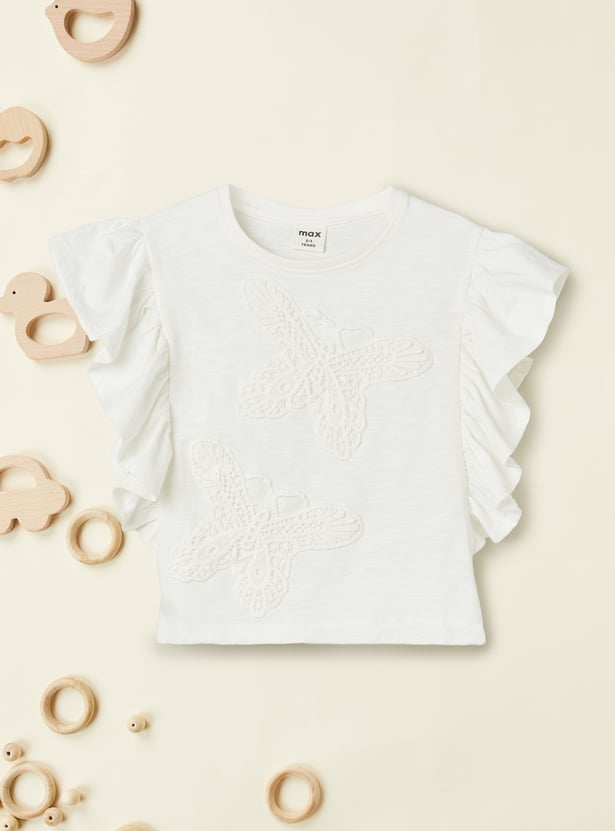 This embroidered top features a beautiful butterfly design on the front, adding a delicate touch of charm. With ruffles on the sides for a playful, feminine look and a classic round neck, it’s perfect for casual outings or adding a stylish twist to your everyday wardrobe.