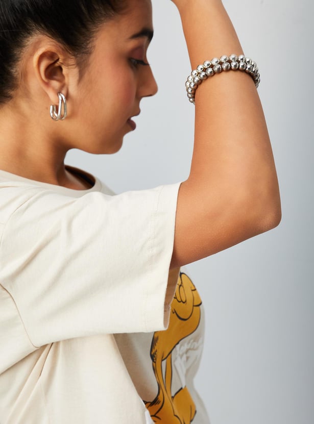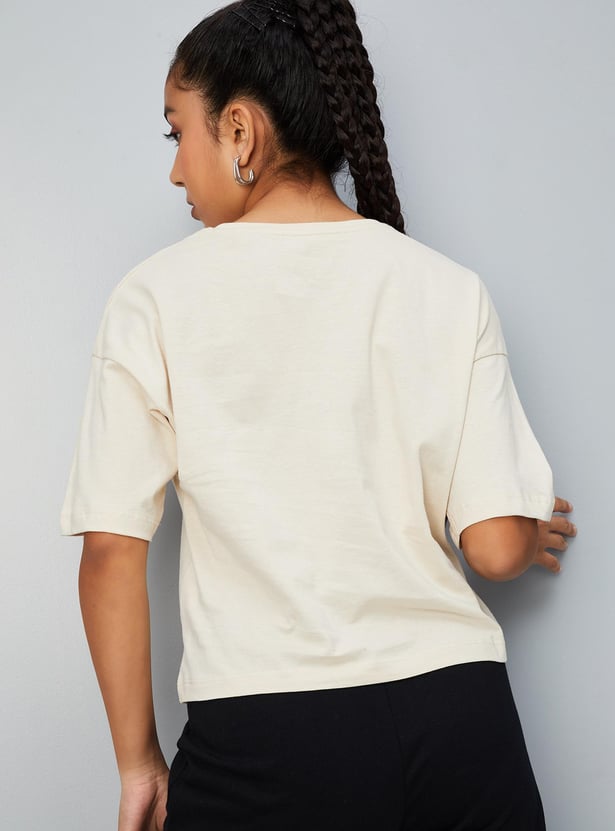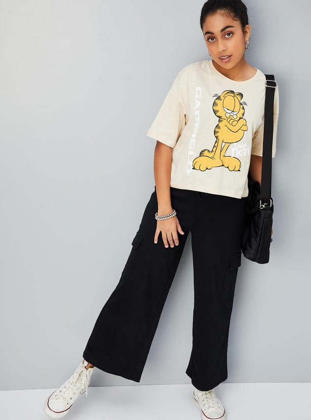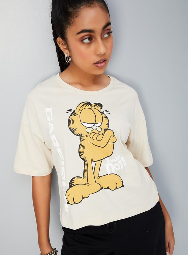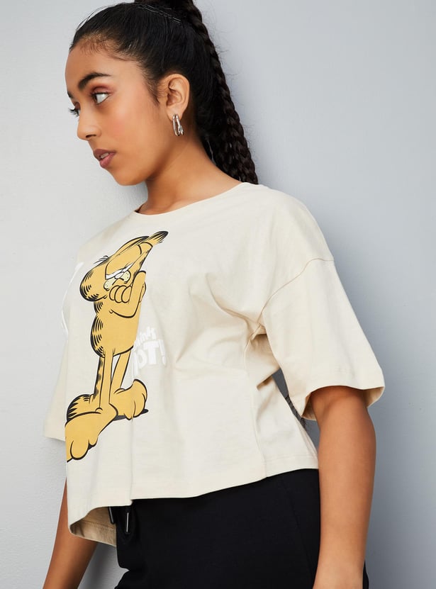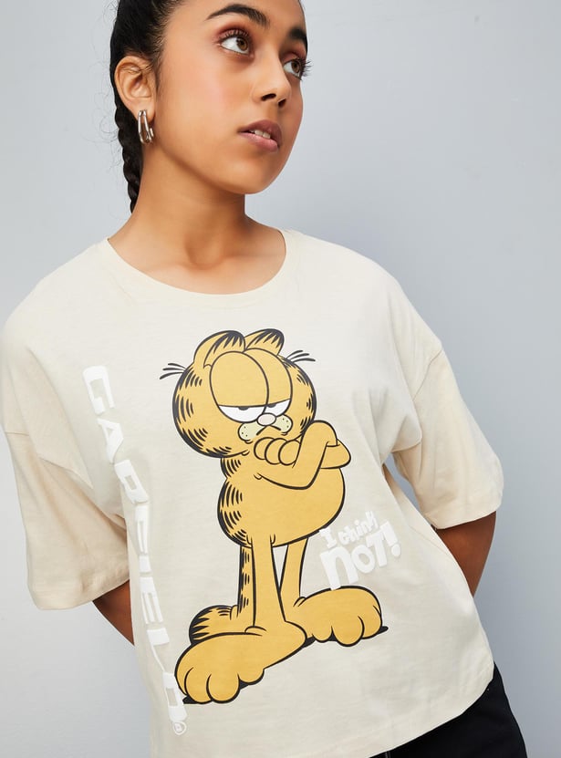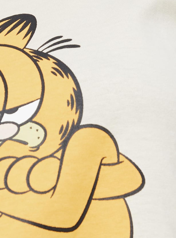 Add a fun twist to your kid's casual wardrobe with this T-shirt. It is styled with a Garfield graphic print, a round neck, and half sleeves.