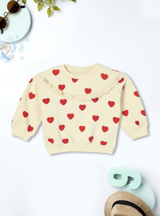 Keep your little one stylish and cosy this winter with this charming sweatshirt. Featuring an all-over heart print, it’s designed with a round neckline, delicate schiffli ruffle detail, full sleeves, and a ribbed hem for a snug fit.