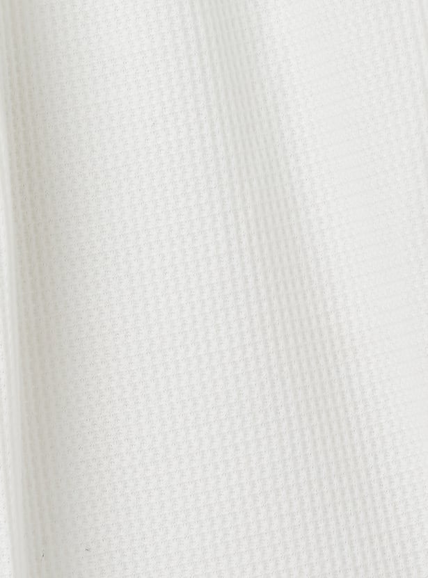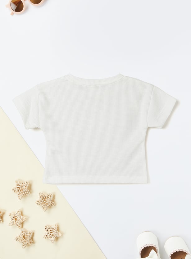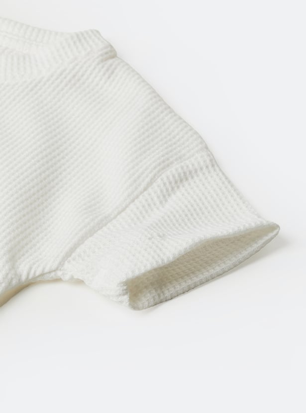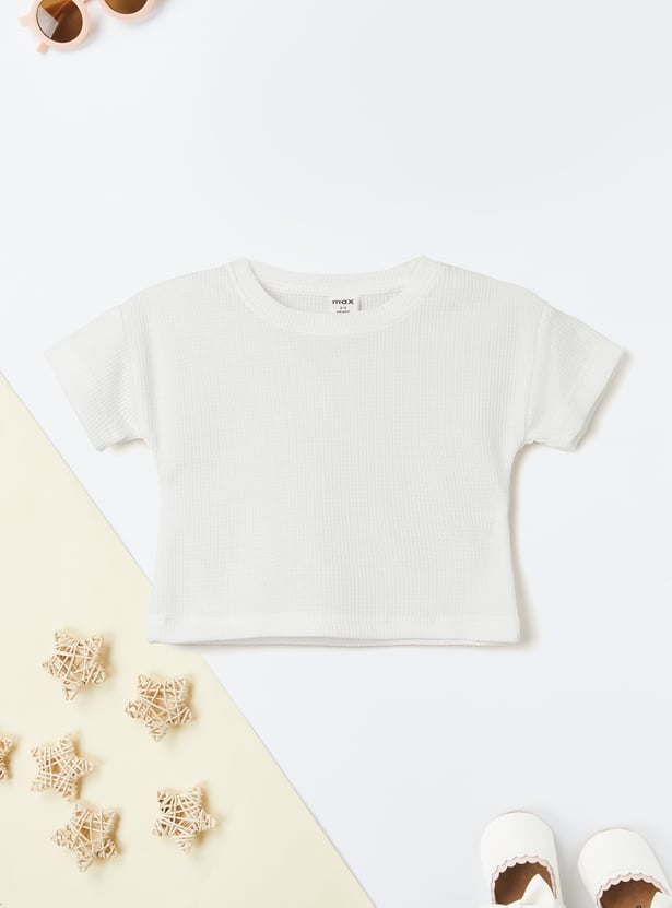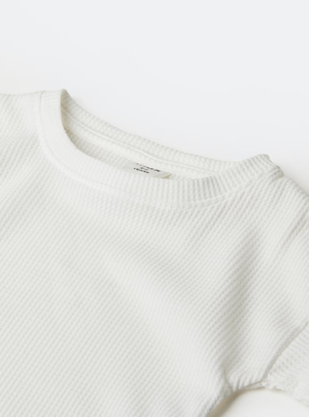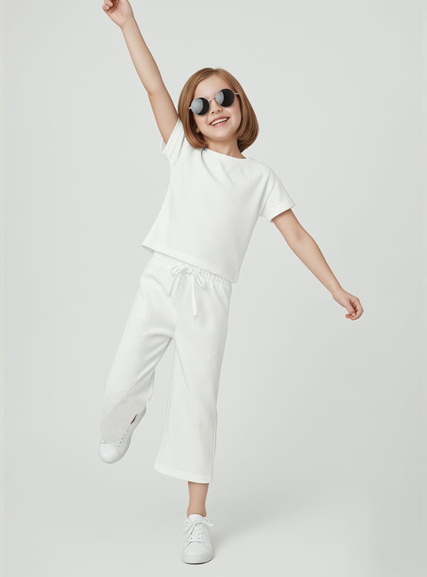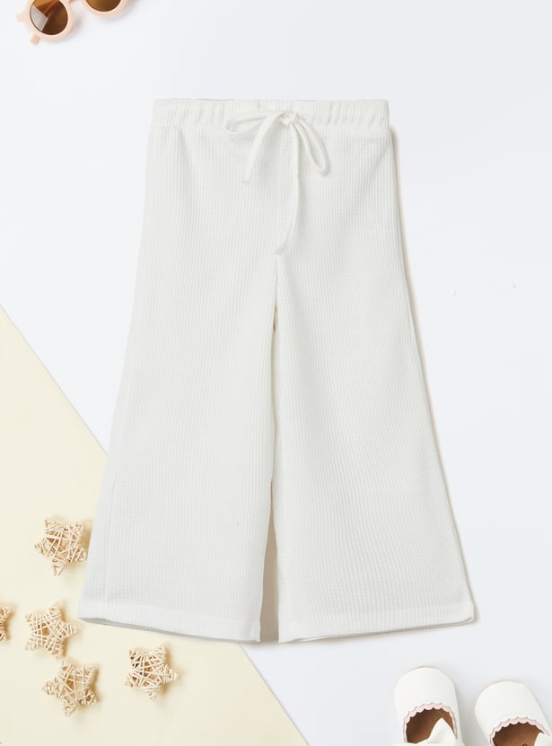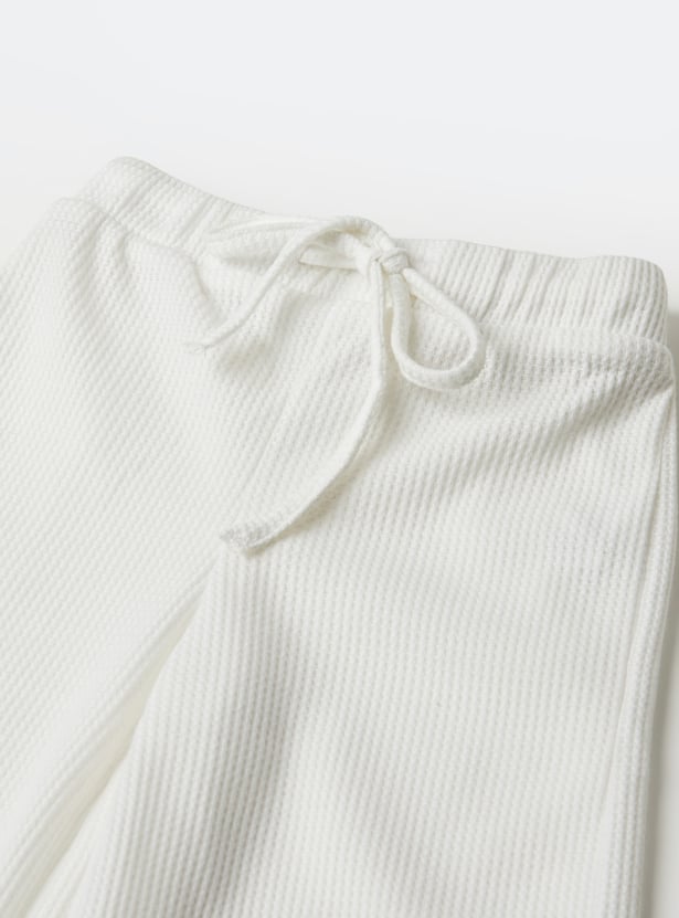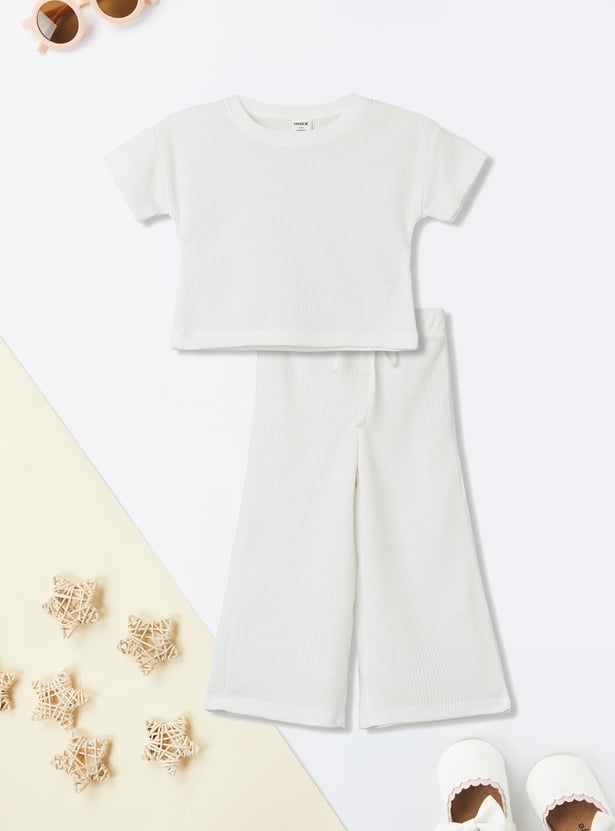 Stay stylish and comfortable with this knitted trousers set. The knit t-shirt features a round neck and half sleeves, while the wide-leg trousers come with a drawstring closure for a relaxed fit.