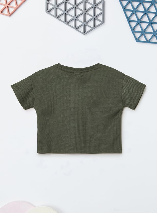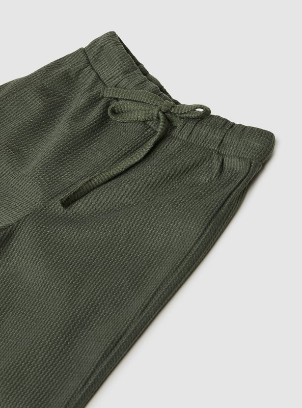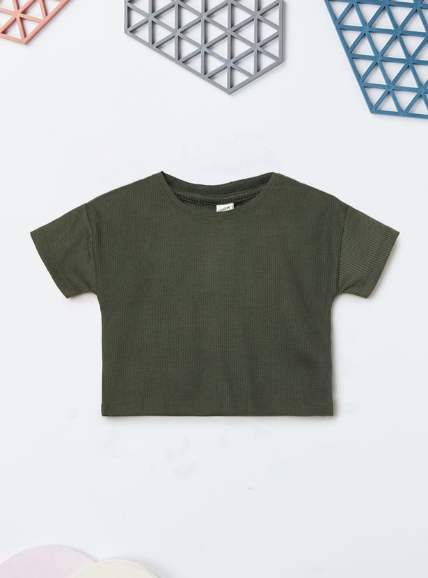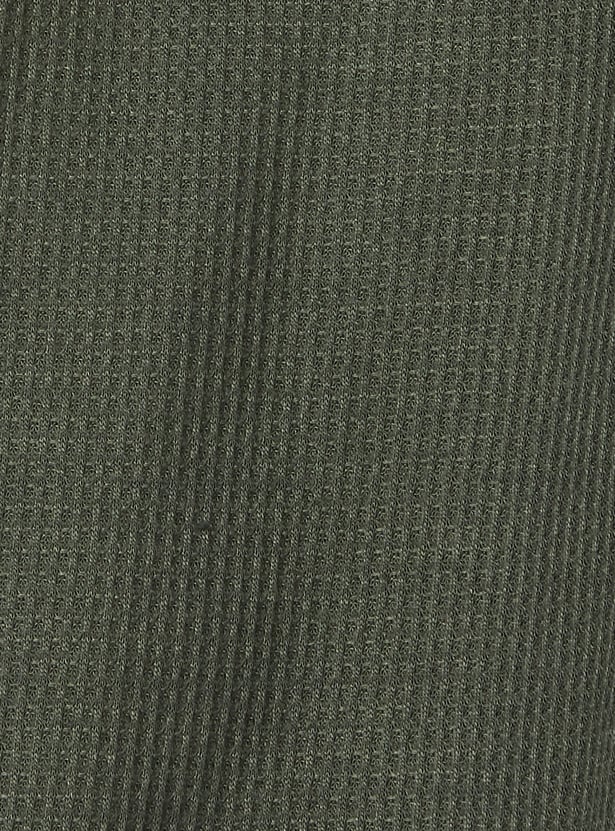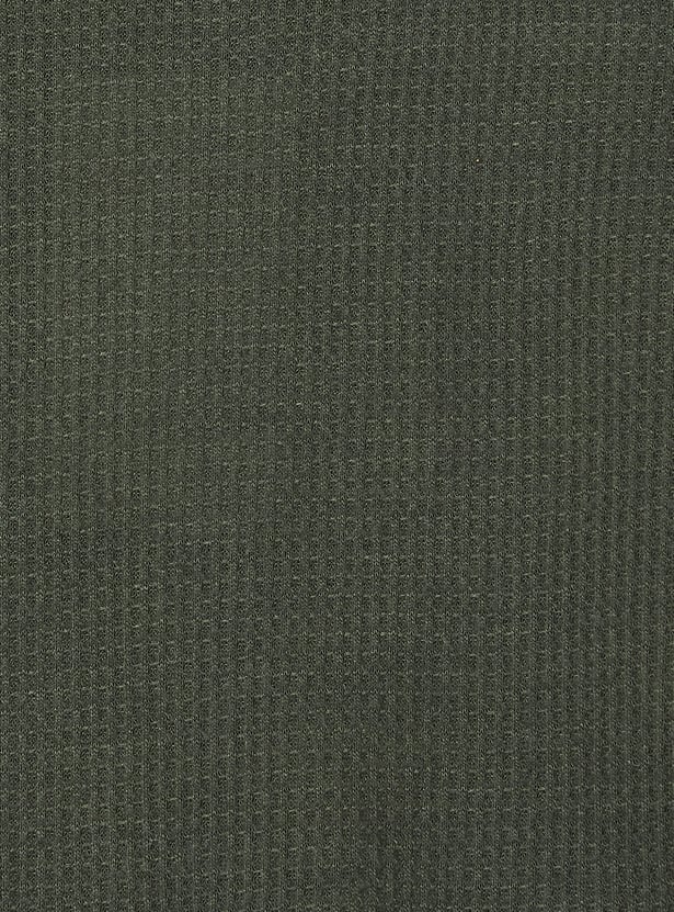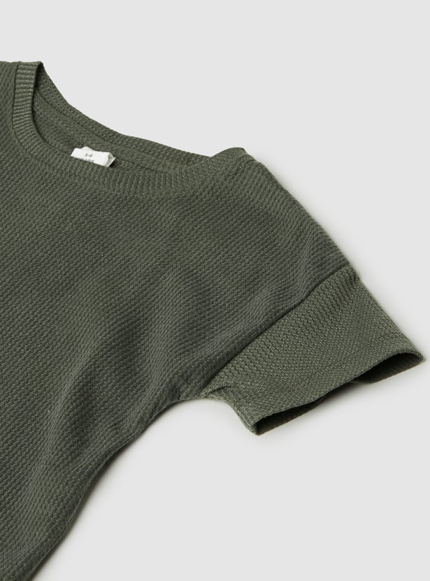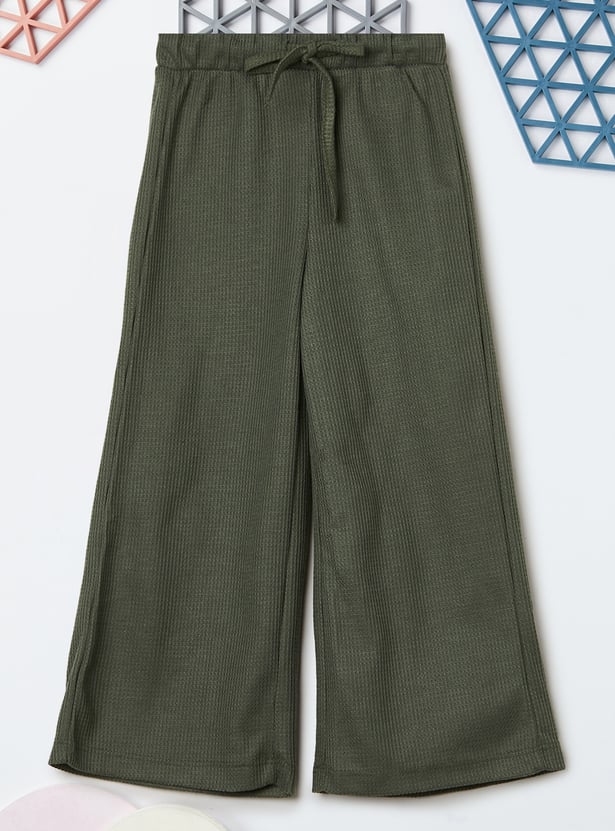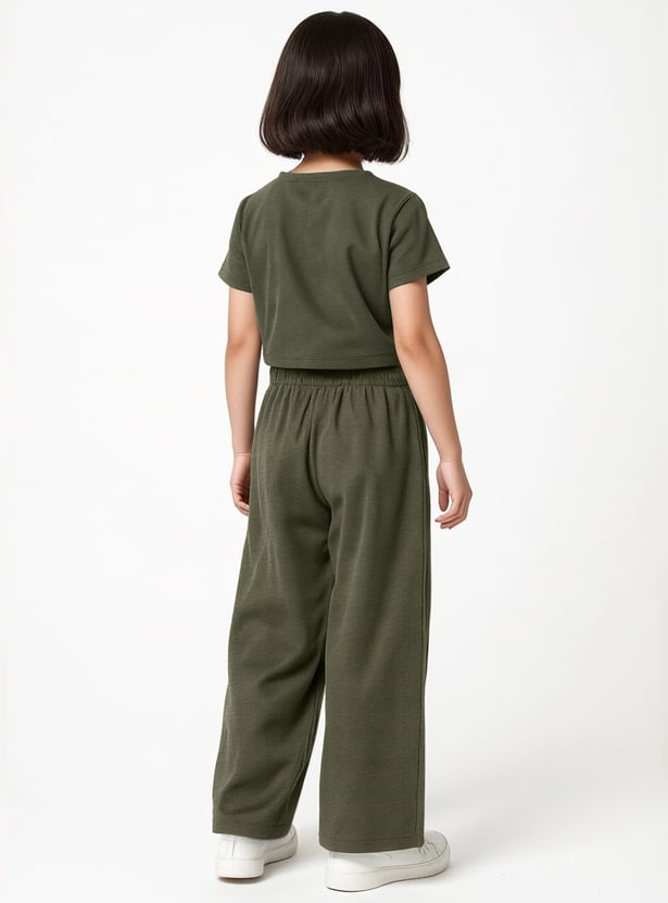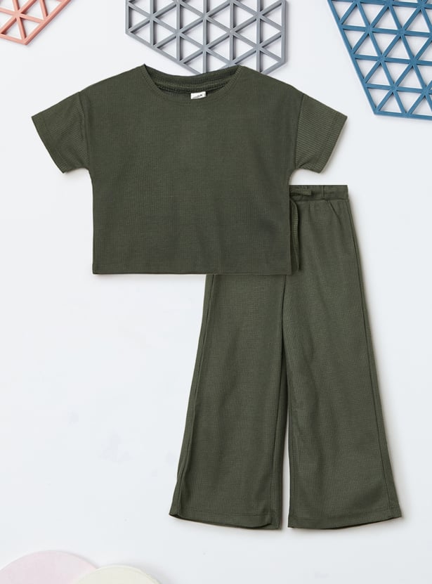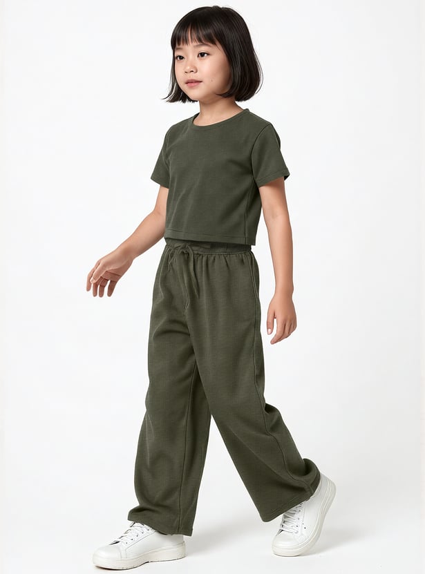 Stay stylish and comfortable with this knitted trousers set. The knit t-shirt features a round neck and half sleeves, while the wide-leg trousers come with a drawstring closure for a relaxed fit.