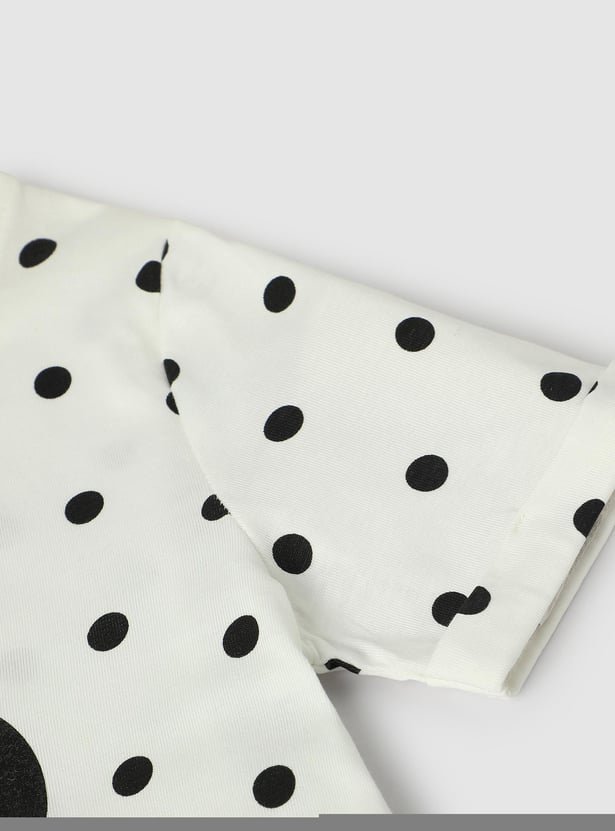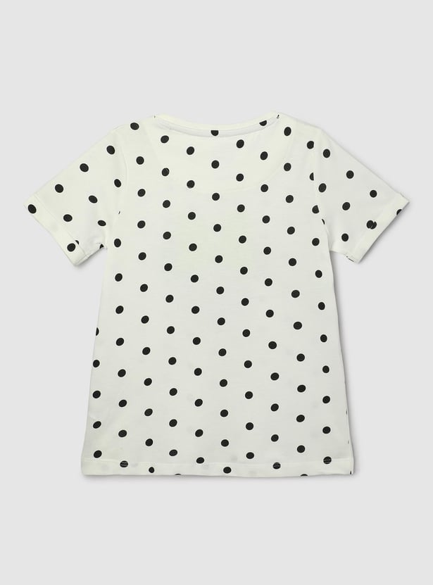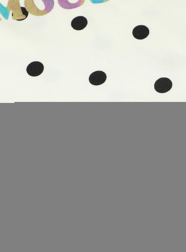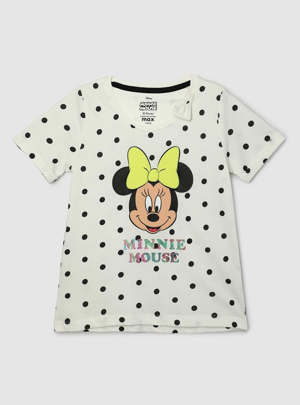 Add a fun twist to your kid's casual wardrobe with this T-shirt updated with polka dots. It is styled with a Minne Mouse print, a round neck, and half sleeves.