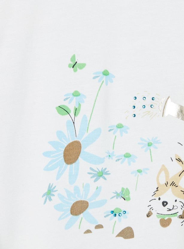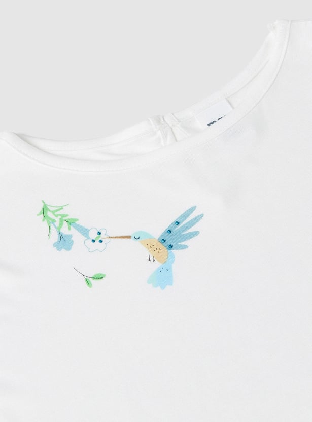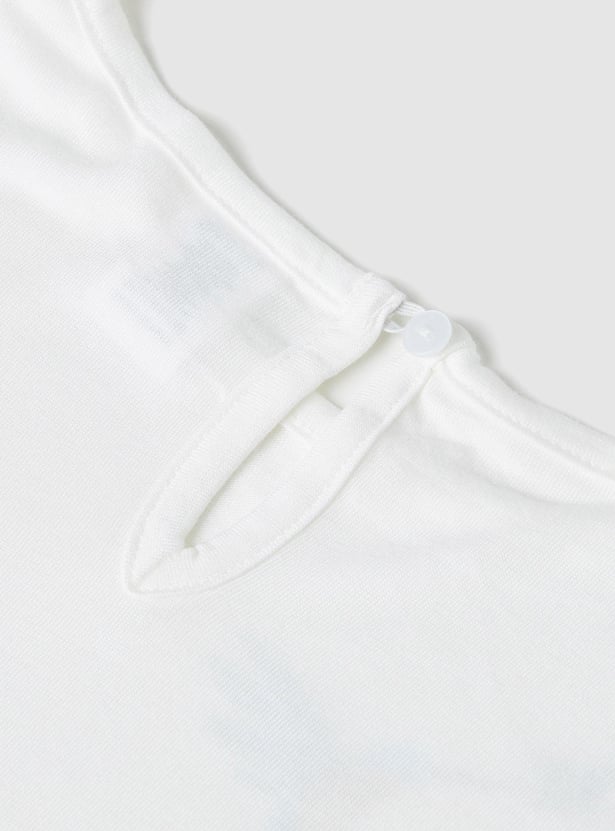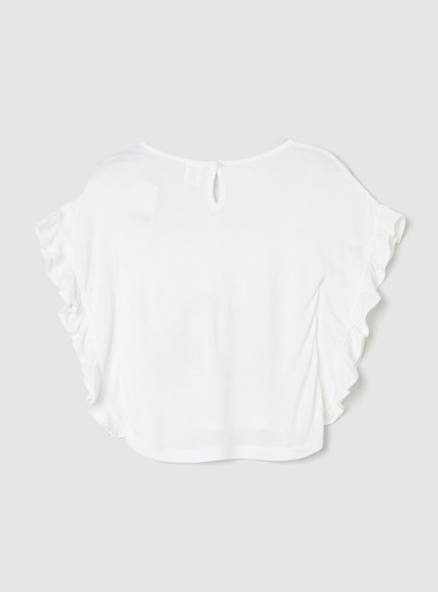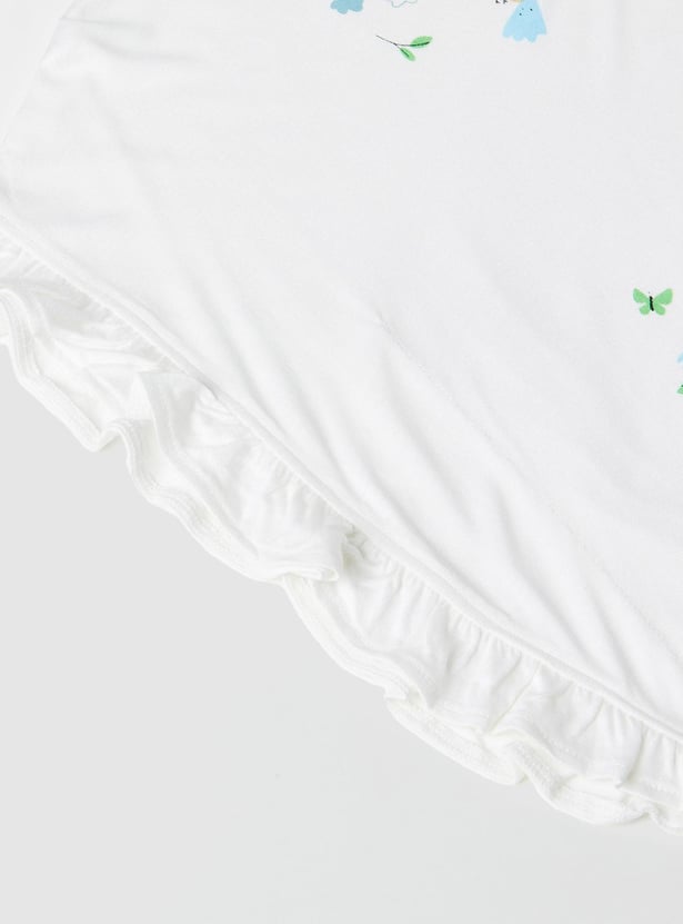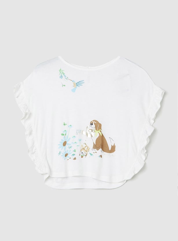 Elevate your kid's casual wardrobe with this fashionable poncho top, which has a graphic print, a round neck, extended sleeves with ruffles, and a button closure.