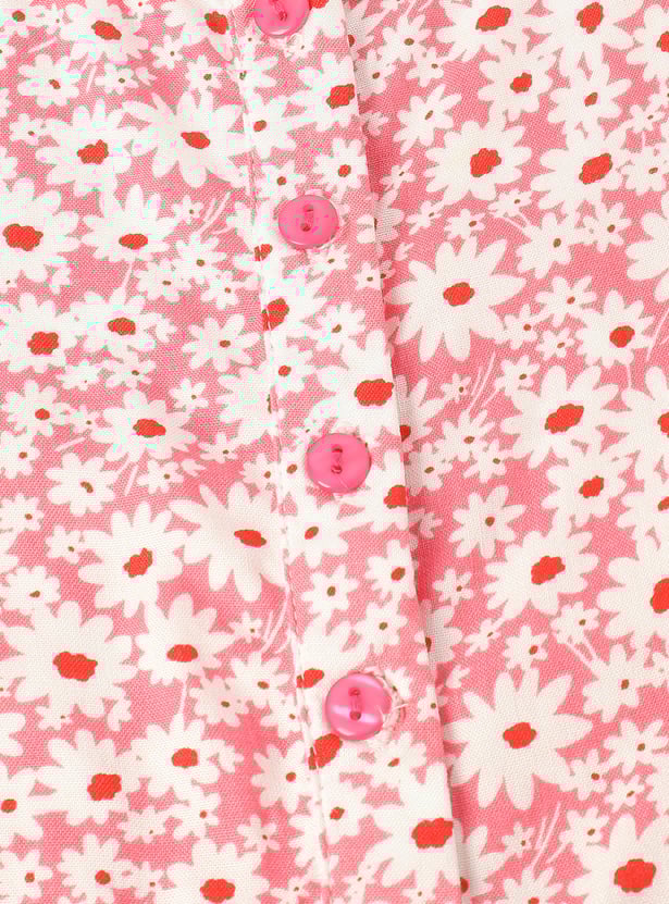 Jazz up her day with this T-shirt, highlighted by vibrant all-over prints. It features a round neckline, half sleeves, and a button placket, finished with a trendy knot at the front hem.