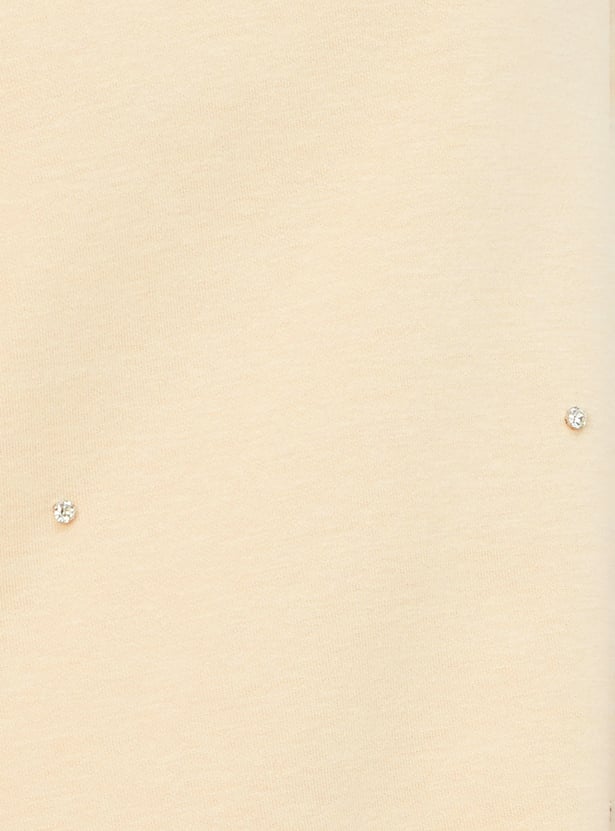 Make her feel like a star in this shift dress. The sparkling rhinestone embellishments catch the light with every movement, adding a touch of glamour to her wardrobe. The comfortable shift silhouette is complemented with a round neck, half sleeves, and patch pockets.
