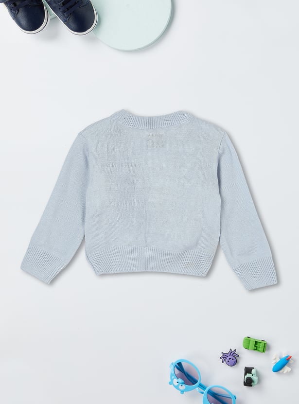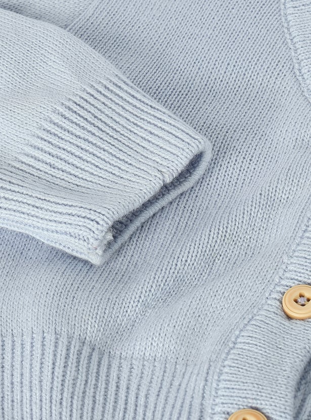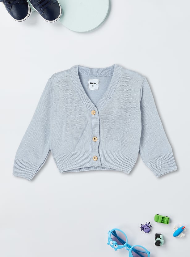 An addition to your kid's style, this solid cardigan is a must-have for the winter wardrobe. It features a classic V-neck, full sleeves, and a cosy knit pattern with a ribbed hem. The front button placket adds a touch of practicality and charm, making it a versatile piece for layering over any outfit.