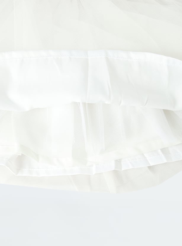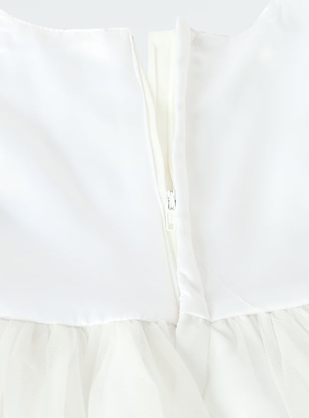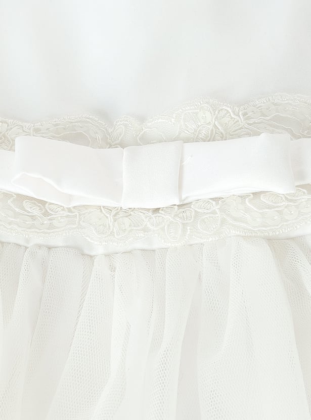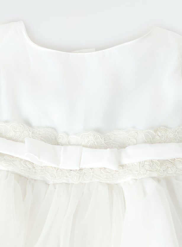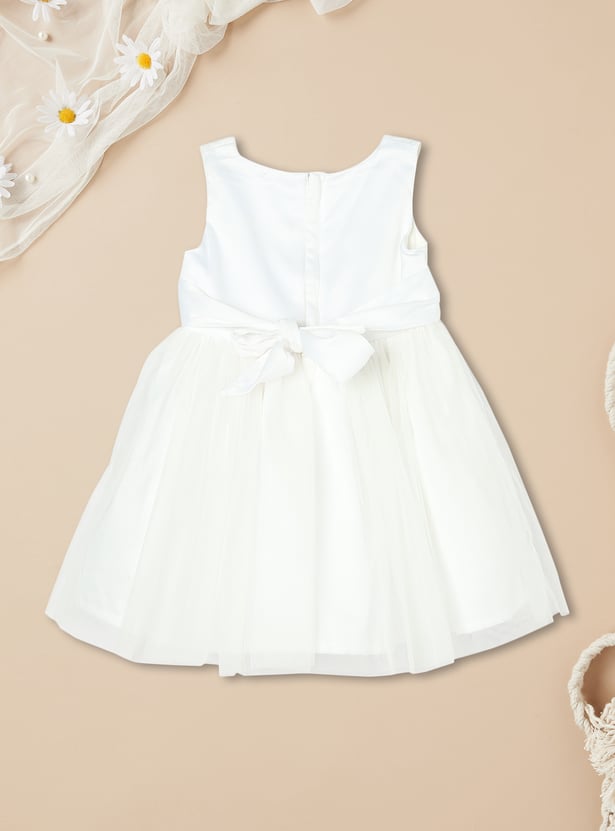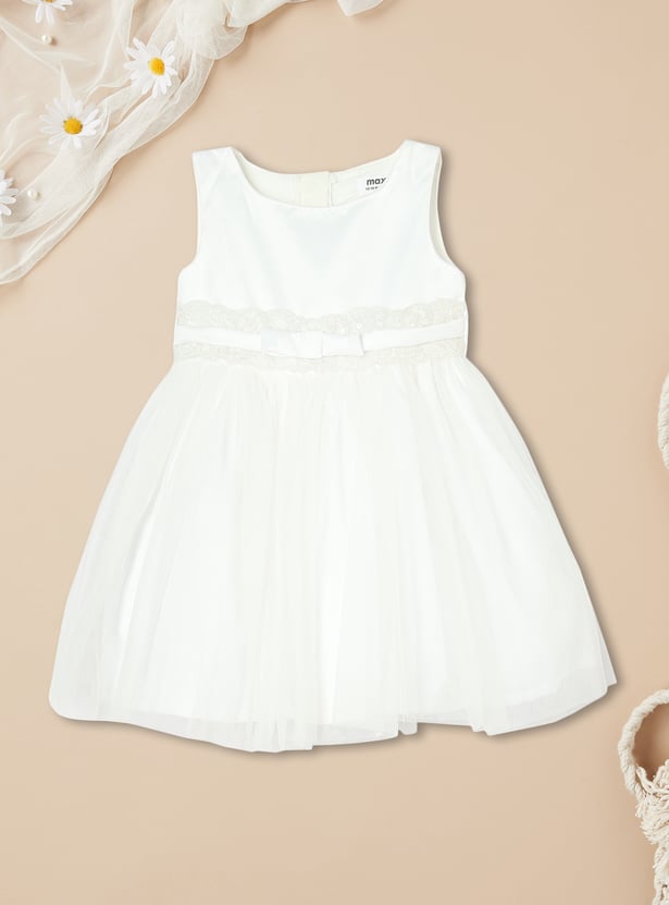 She’ll make a chic statement at the party in this adorable fit-and-flare dress. Featuring a round neck with charming bow detailing, this sleeveless dress offers a sweet yet stylish look. The tie-up detail at the back adds an extra touch of elegance, making it perfect for any special occasion.