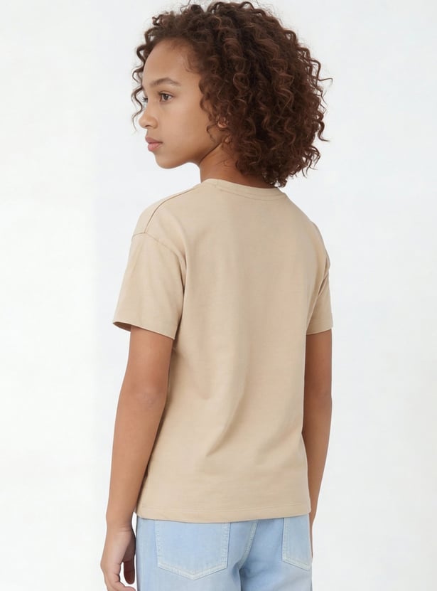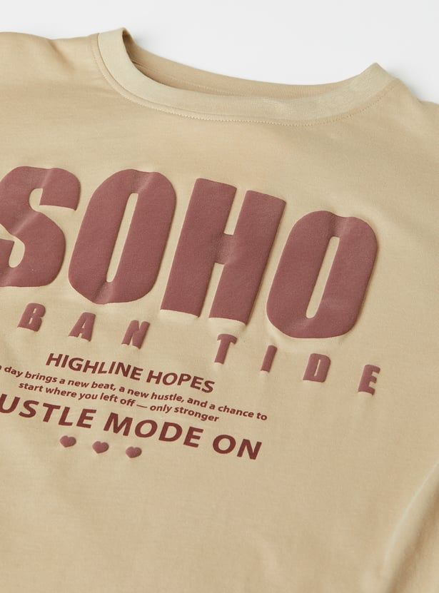 A fun typographic print T‑shirt designed with a round neck and half sleeves, perfect for everyday comfort and playful style.