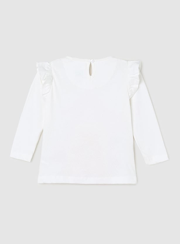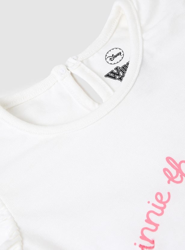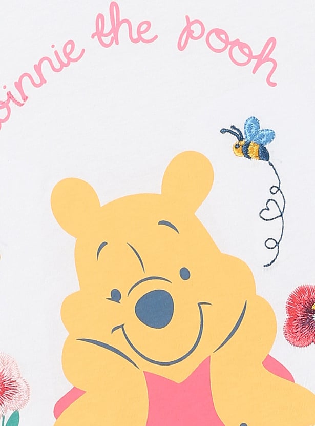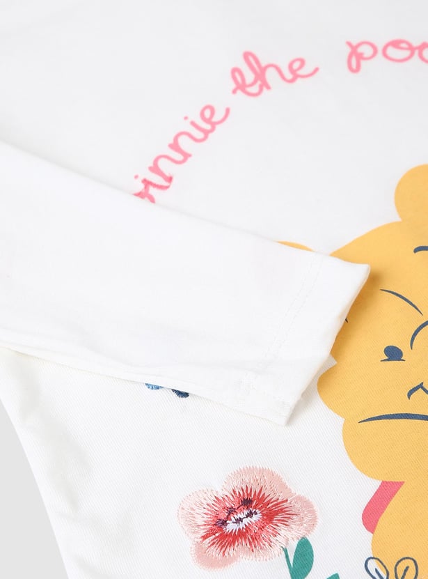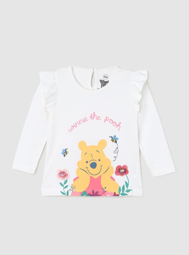 This T-shirt features a charming Winnie The Pooh printed design and has full sleeves with a ruffle design and a round neckline that will add some flair to your child's casual wardrobe. Pair it with jeans and sneakers to prepare your little one for a vacation.
