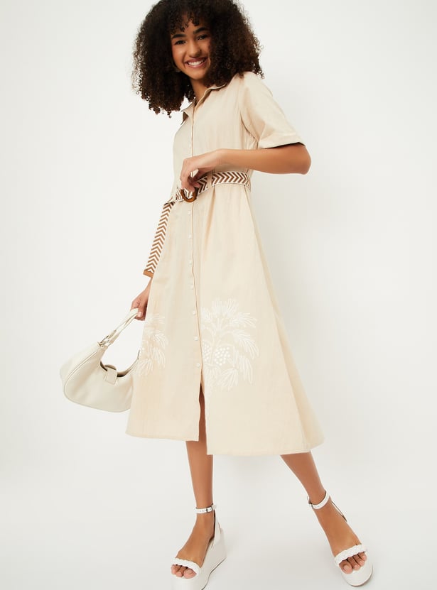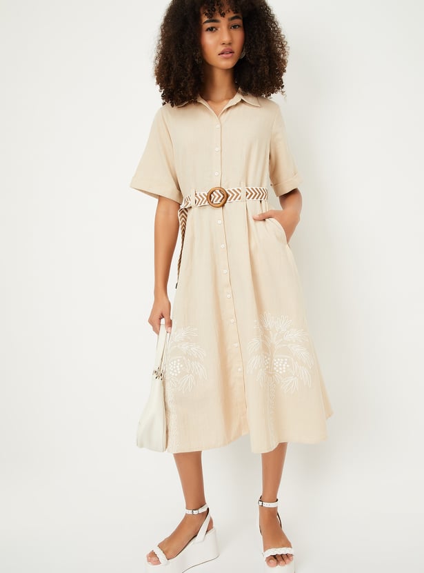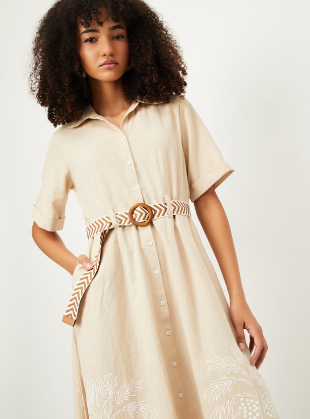 Add a touch of elegance to your wardrobe with this embroidered belted shirt dress. Featuring a button placket, spread collar, side pockets, and half sleeves, this dress combines style and comfort effortlessly. The intricate embroidery and belted waist offer a flattering and chic fit.