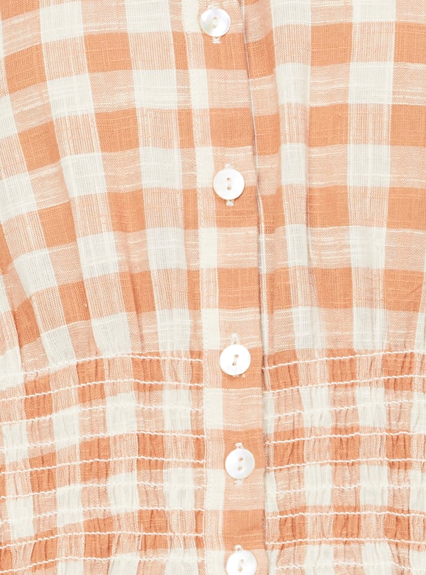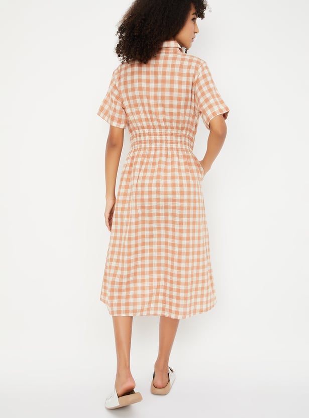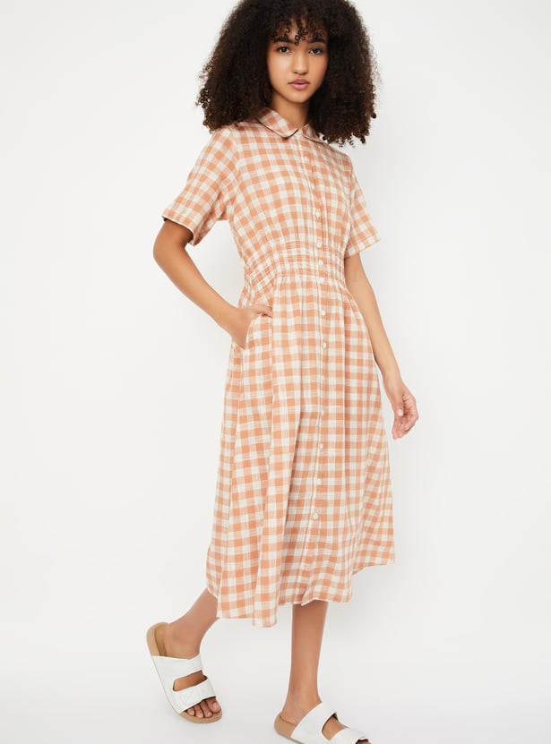 This checked shirt dress combines style and comfort with a midi length, smocked waist for a flattering fit, side pockets, and a button placket with a spread collar. The half sleeves add a relaxed touch, making it perfect for any occasion.