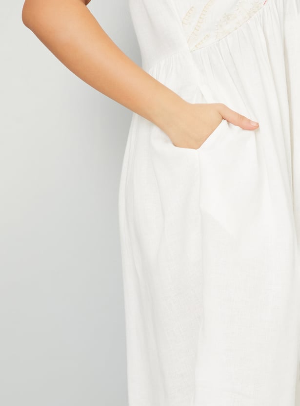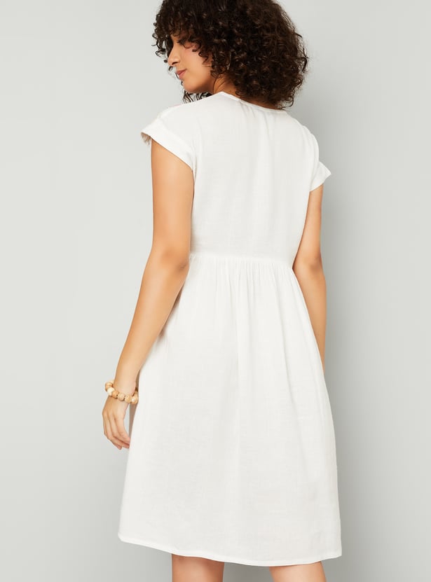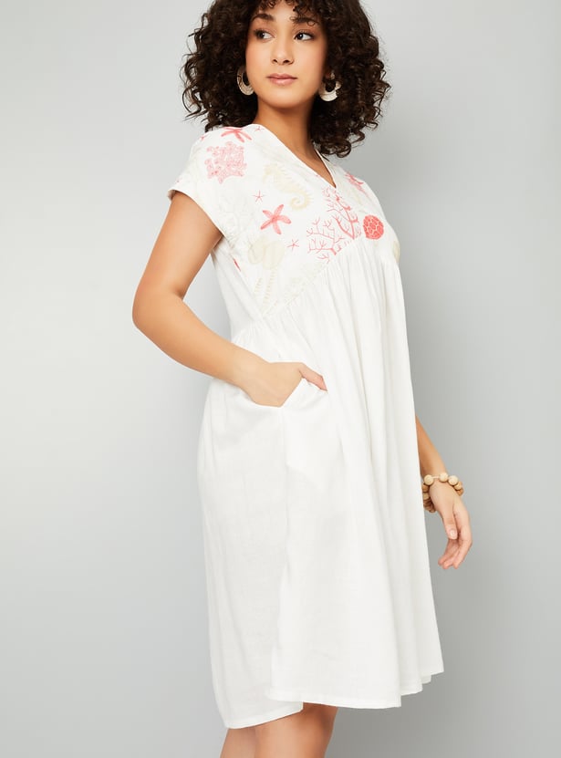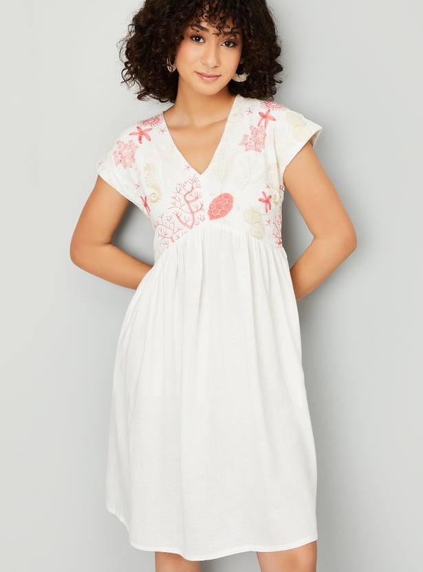 Add a touch of elegance to your wardrobe with this embroidered A-line dress. Featuring a flattering V-neck, half sleeves, side pockets, and a knee-length silhouette, it's perfect for any occasion.