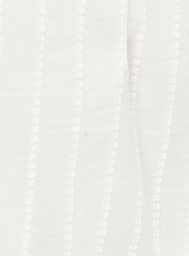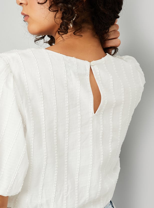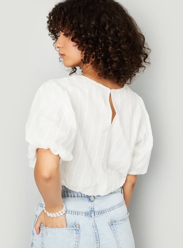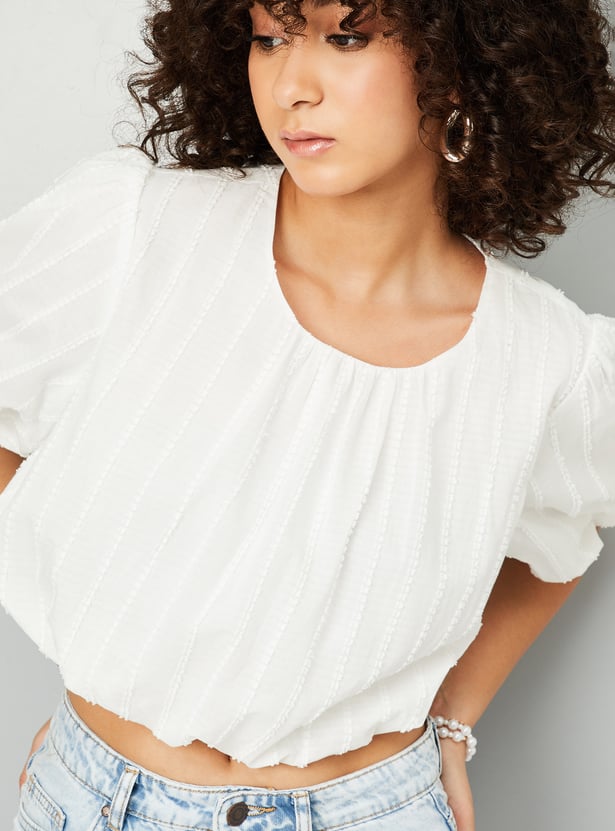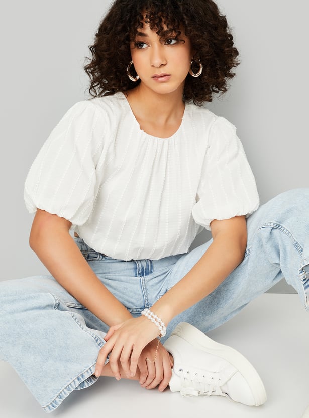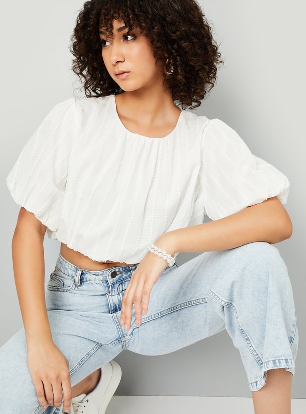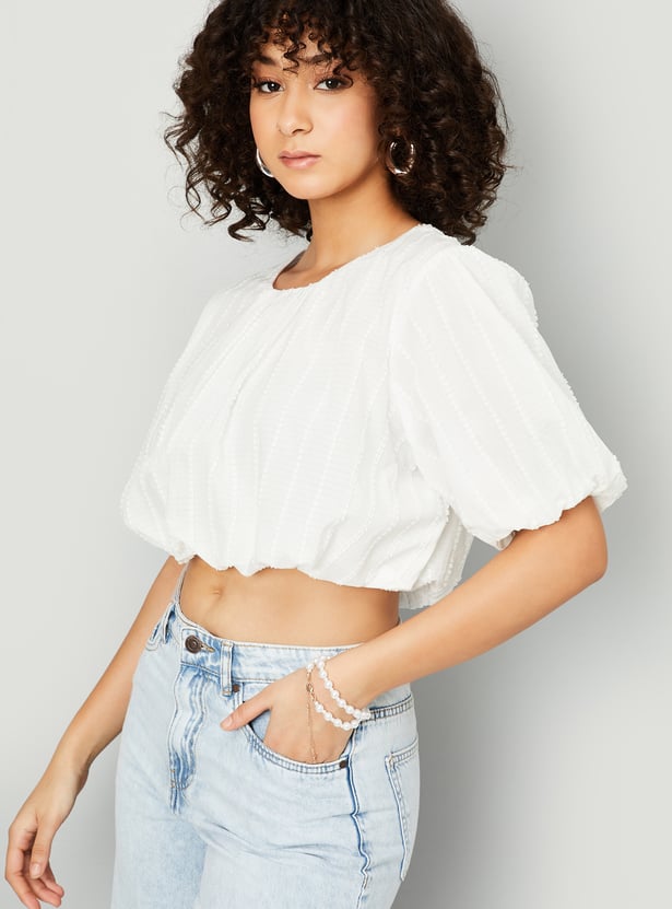 The embroidered blouson crop top is a perfect blend of charm and elegance. Featuring a round neckline, puff sleeves, and intricate embroidery, this crop top adds a touch of whimsy to any outfit.