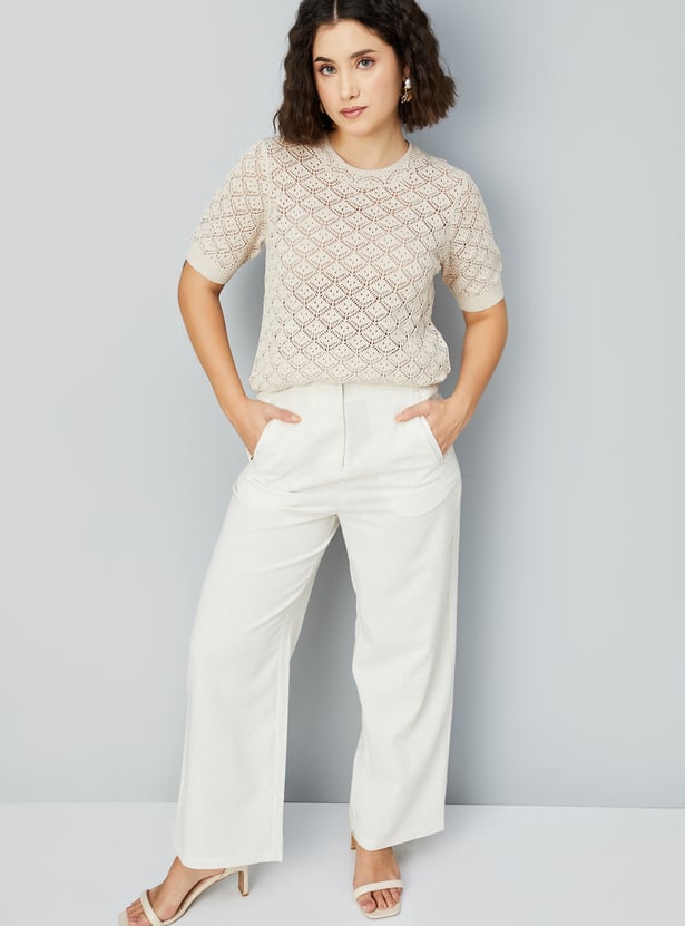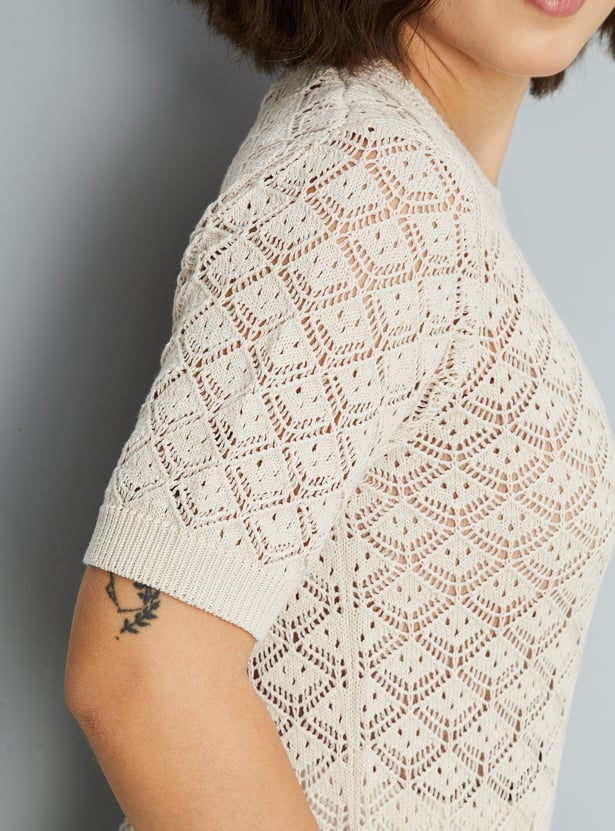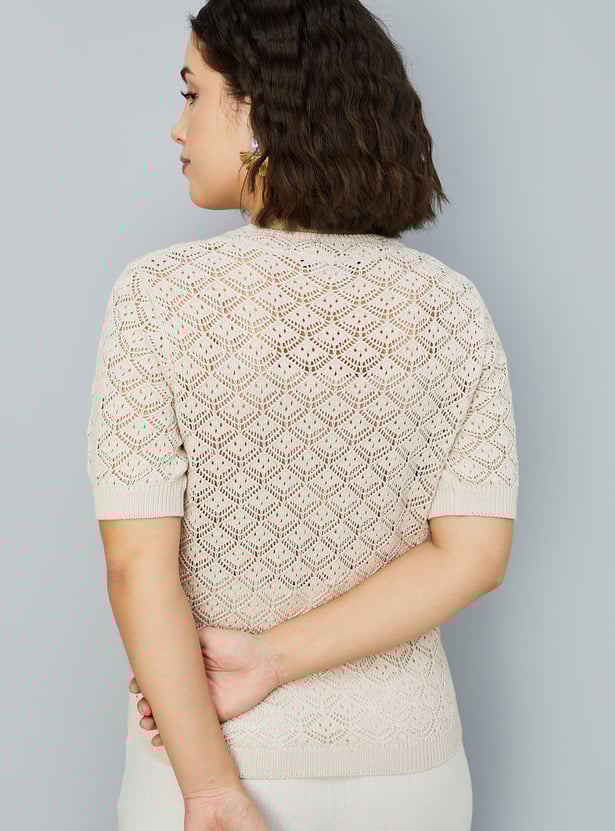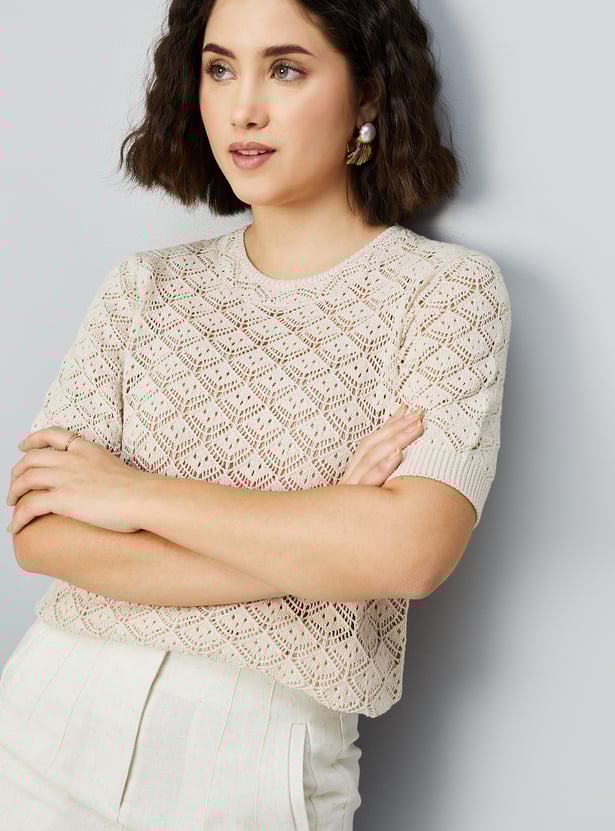 Elevate your casual wardrobe with this delicate lace knit blouse. Featuring a round neck and half sleeves, it combines intricate lace details with a comfortable, breathable design.