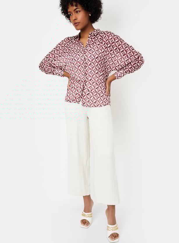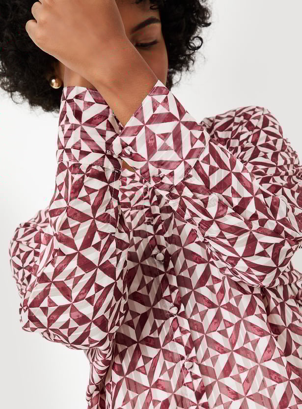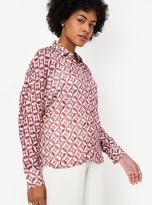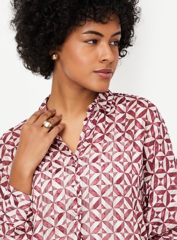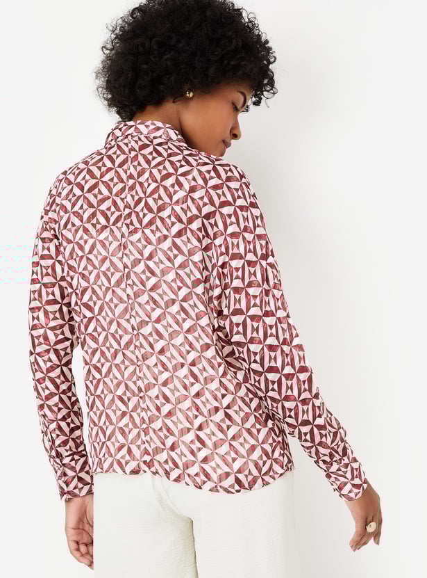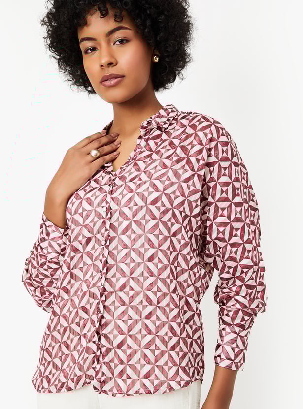 Brighten your day with this blouse, updated with vibrant prints all over. It features a spread collar, full sleeves with cuffs, and a curved hem, and comes with a solid camisole for added versatility.