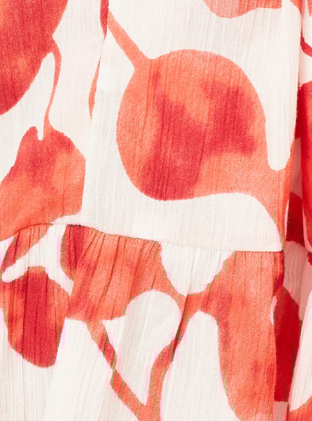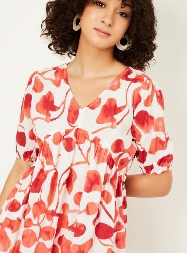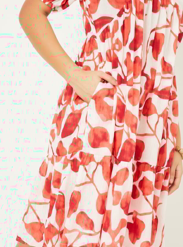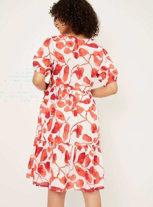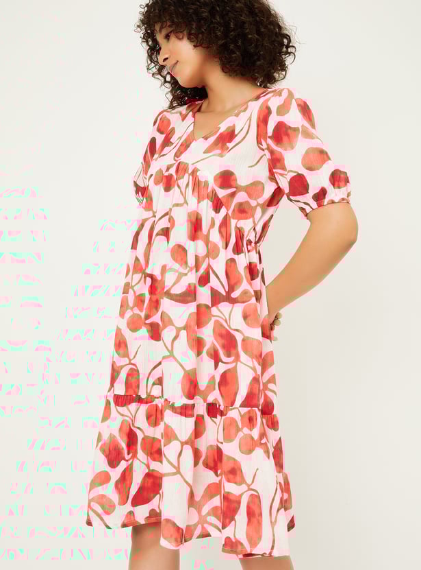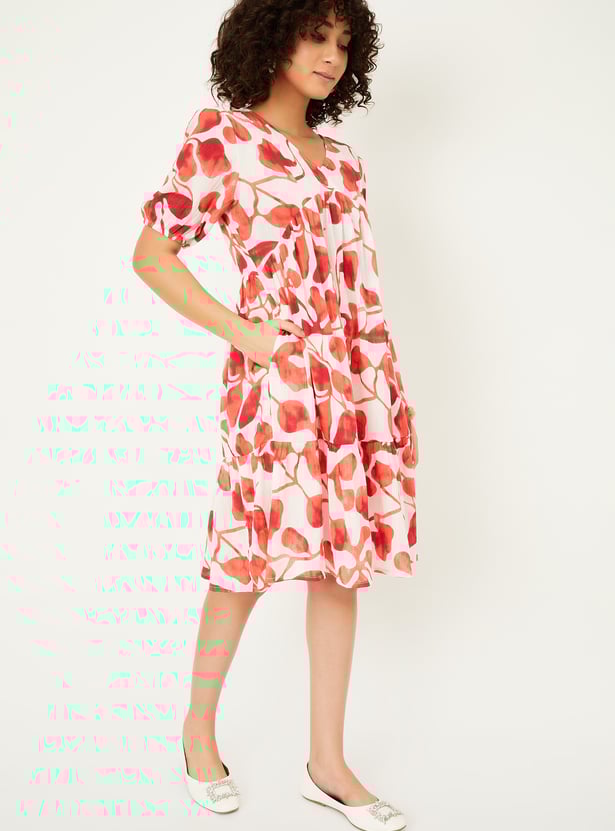 Elevate your wardrobe with this printed tiered dress, a perfect blend of elegance and playfulness. Featuring a flattering V-neck, side pocket, puff sleeves, and a chic knee-length silhouette, its tiered design adds a flowy, graceful touch.