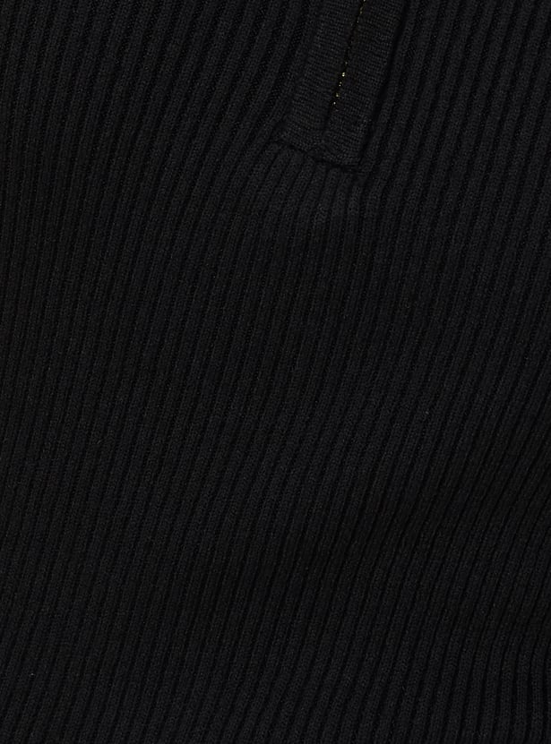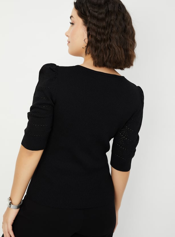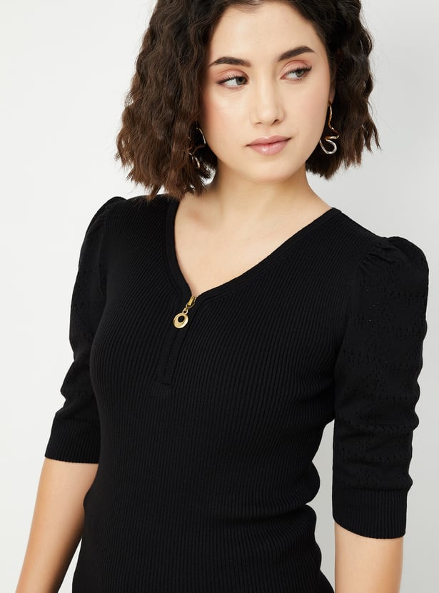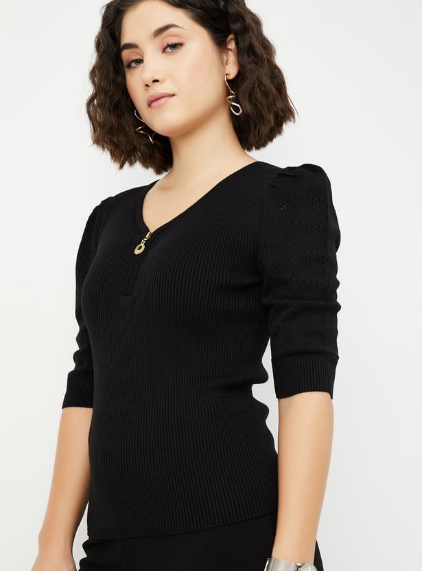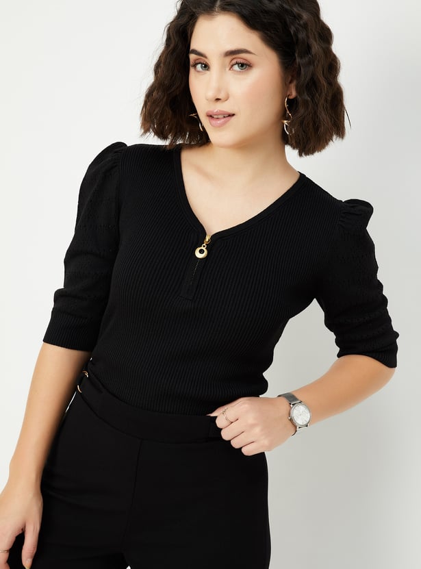 This ribbed blouse adds a modern twist to your wardrobe with its flattering V-neck design, complete with a stylish zip closure. The puff sleeves elevate the look, offering a blend of comfort and sophistication.
