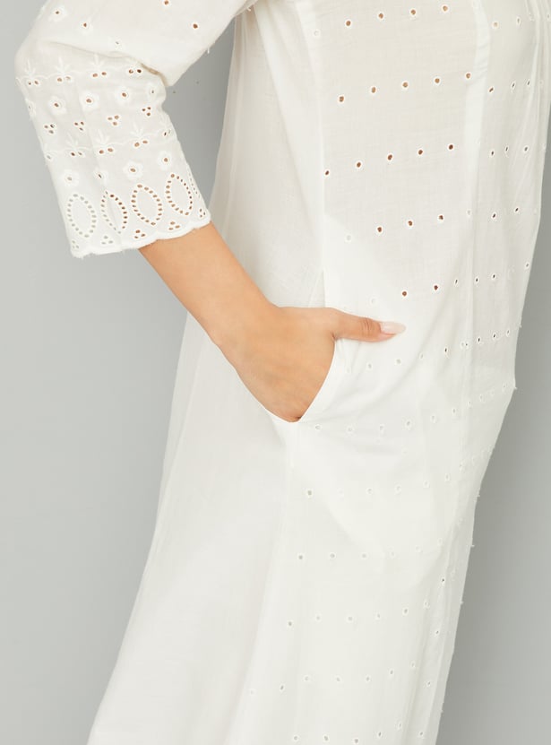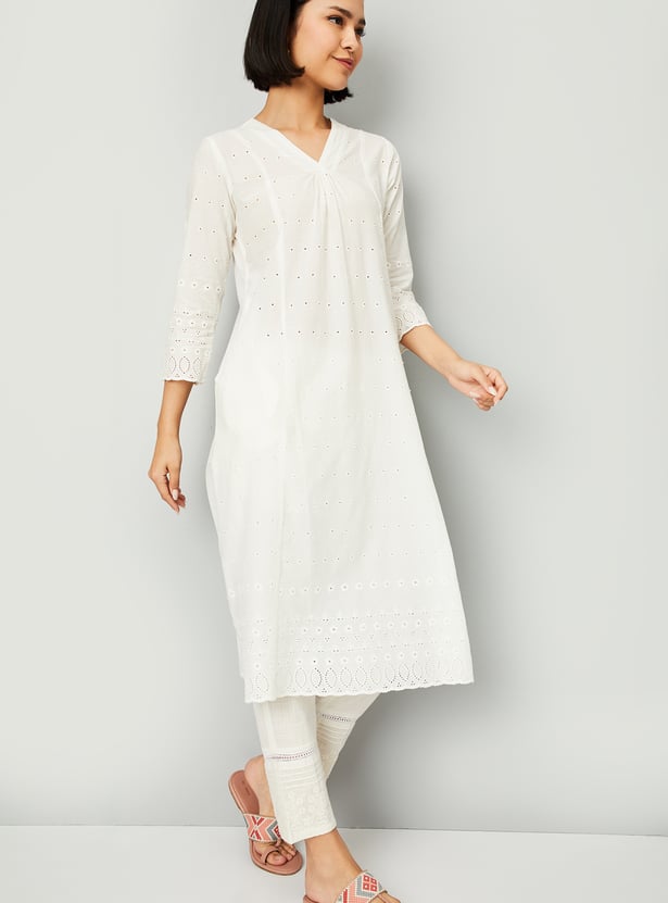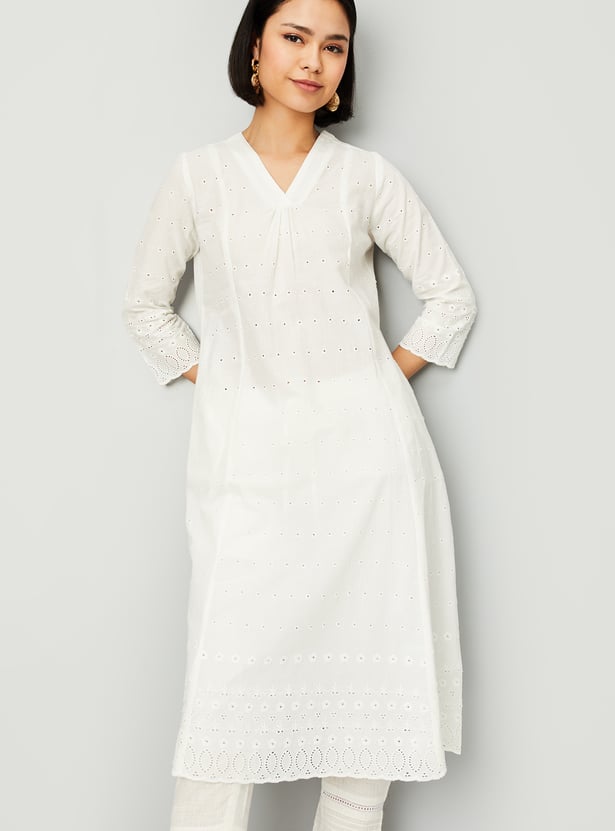 This schiffili embroidered a-line kurta is a perfect blend of simplicity and elegance, featuring a V-neck, 3/4th sleeves for easy movement. The intricate embroidery adds a touch of sophistication to the classic straight silhouette.