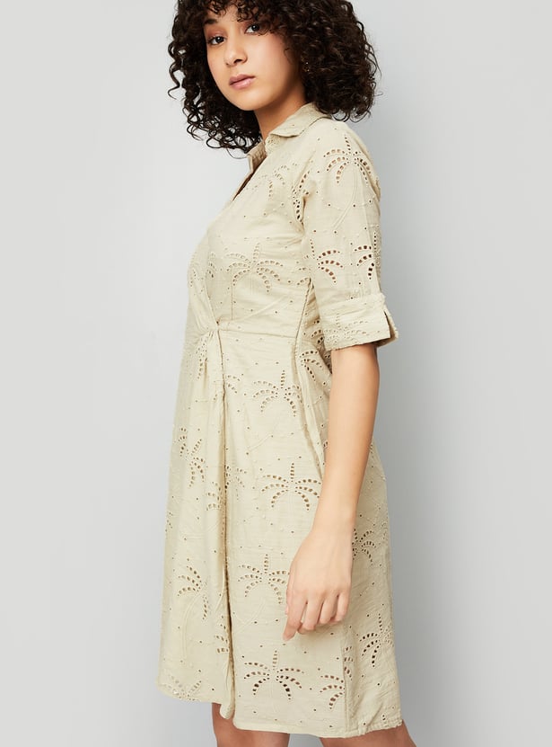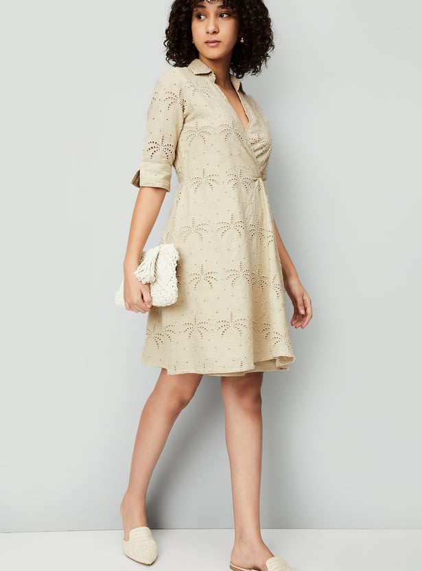 Embrace boho vibes with this chic Schiffli wrap dress. Featuring a spread collar, breezy half sleeves, and an asymmetric hem, it adds a free-spirited flair perfect for day-to-night transitions with ease.