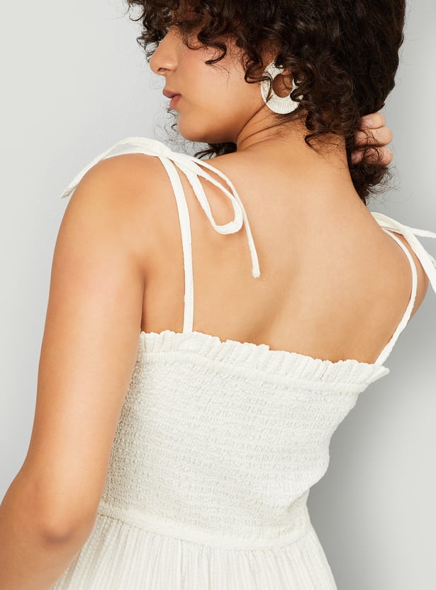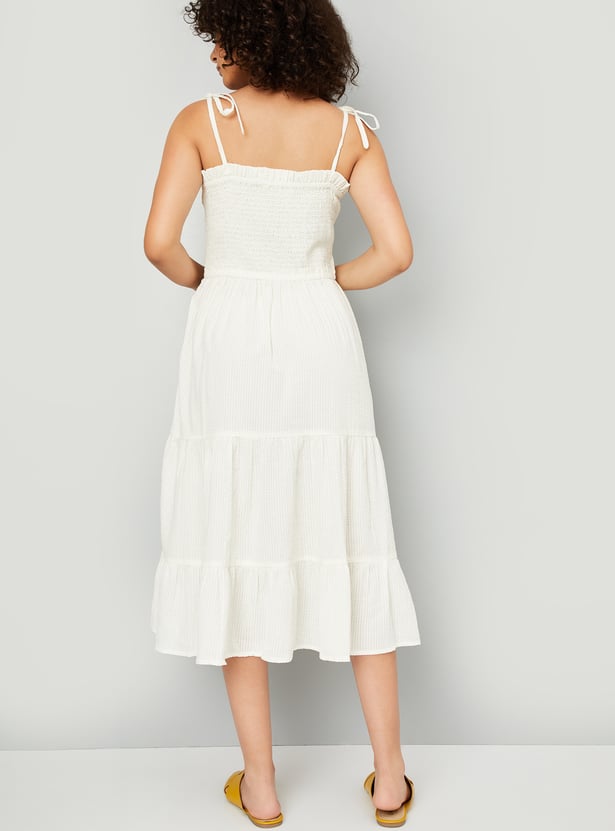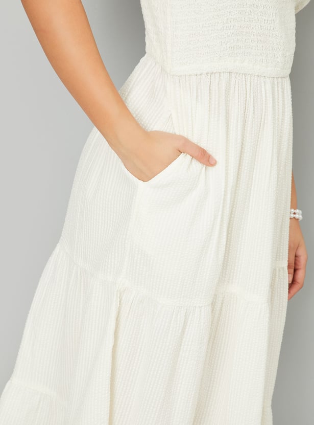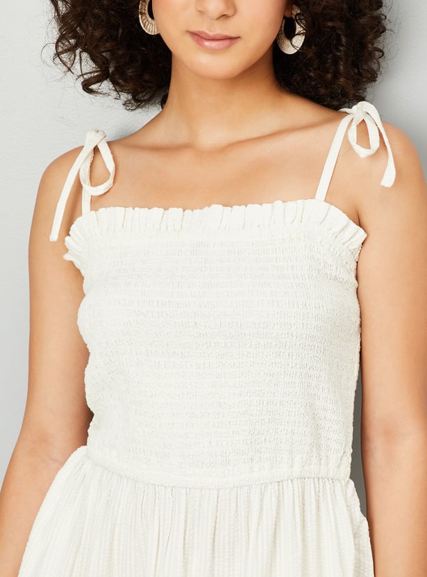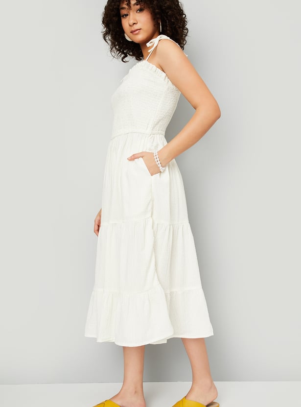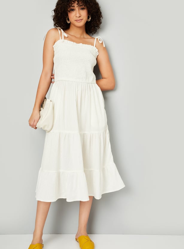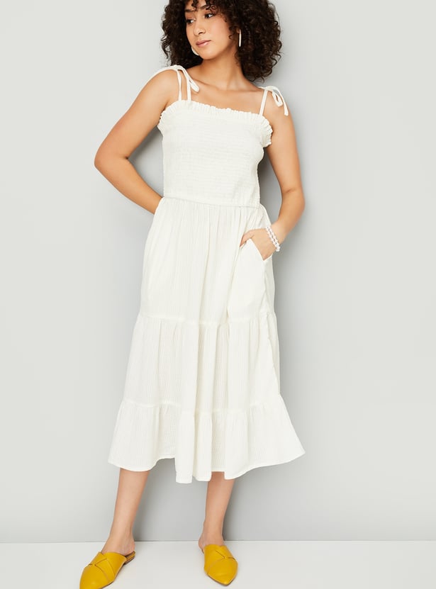 This solid tiered dress brings a graceful flow and chic simplicity to your wardrobe. Designed with delicate spaghetti straps, a square neckline, and a smocked bodice, it ensures a flattering fit and effortless style.