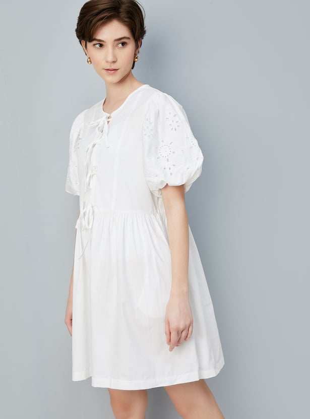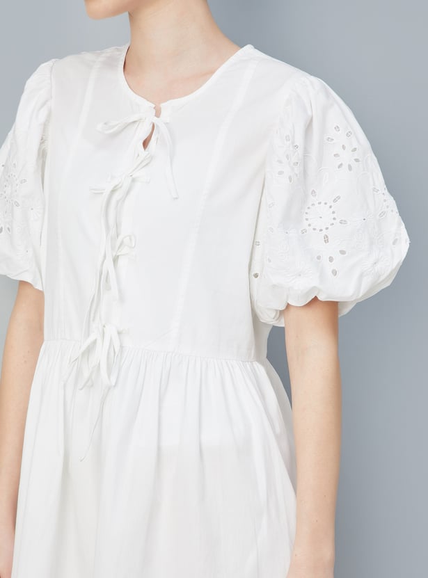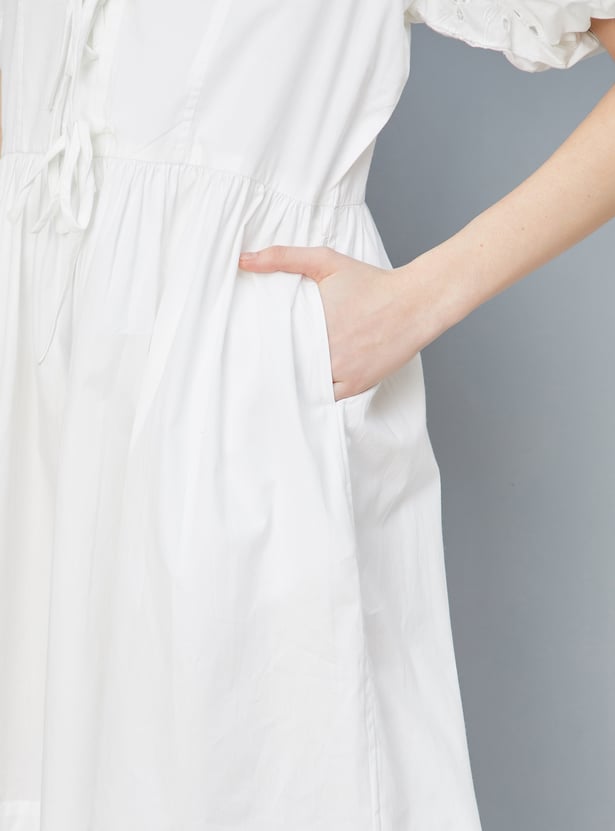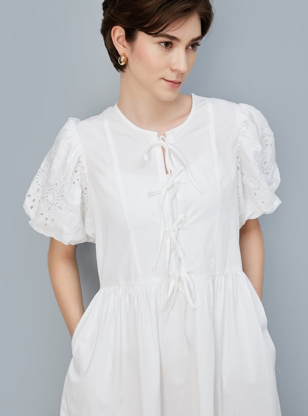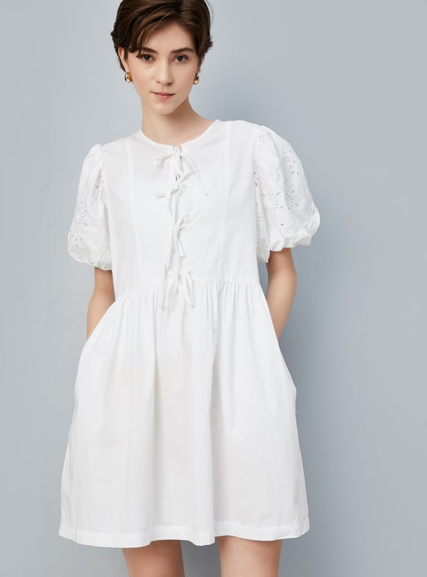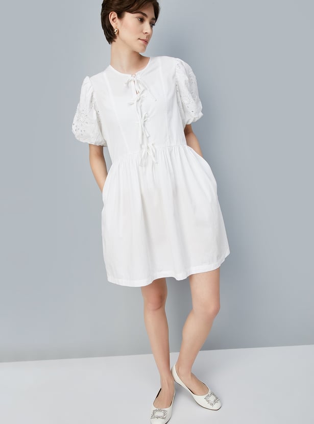 This charming A-line dress features a tie-up front, puff sleeves, and a flared hem, offering a flattering and feminine silhouette. The round neck adds a classic touch, making it perfect for both casual and dressy occasion.