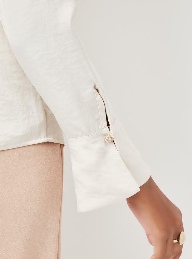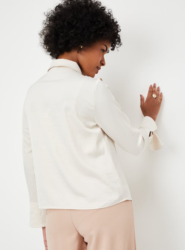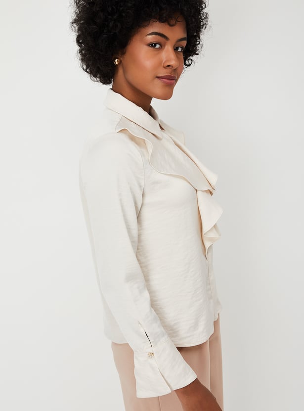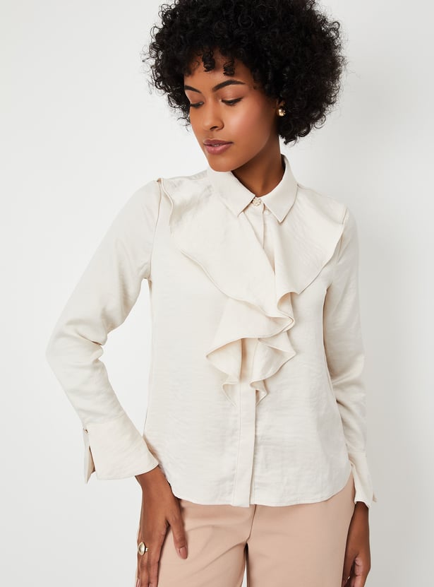 Elevate your style with this chic solid blouse, featuring a trendy spread collar adorned with ruffle details, full sleeves, and a convenient button closure. Perfect for adding a touch of sophistication to any outfit.