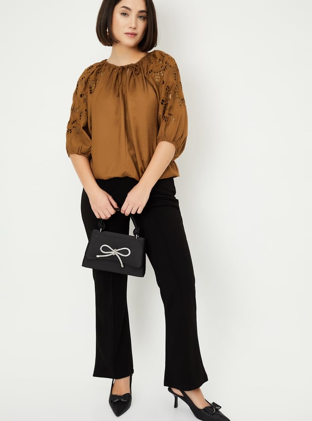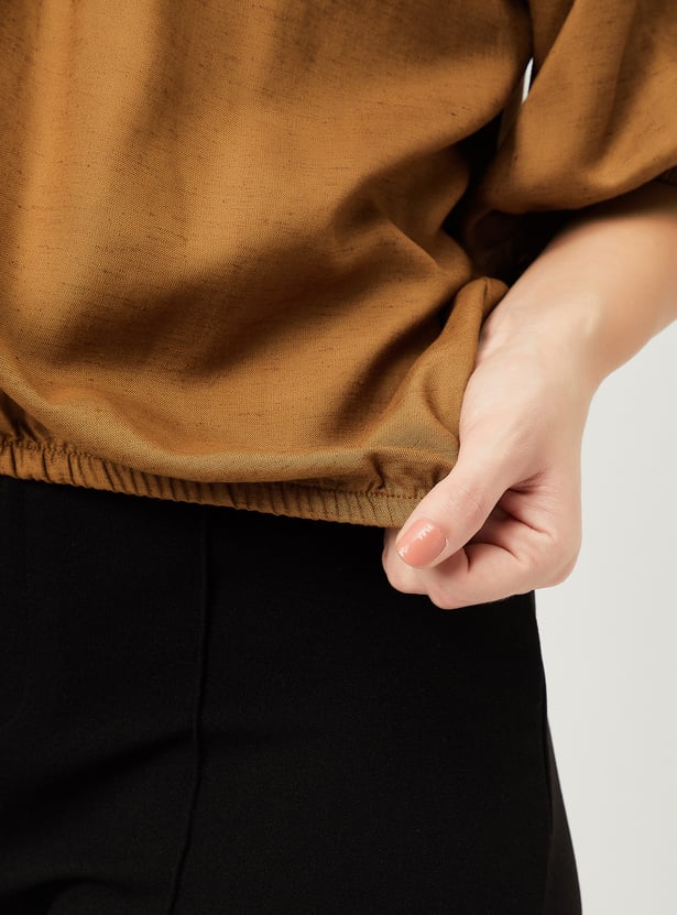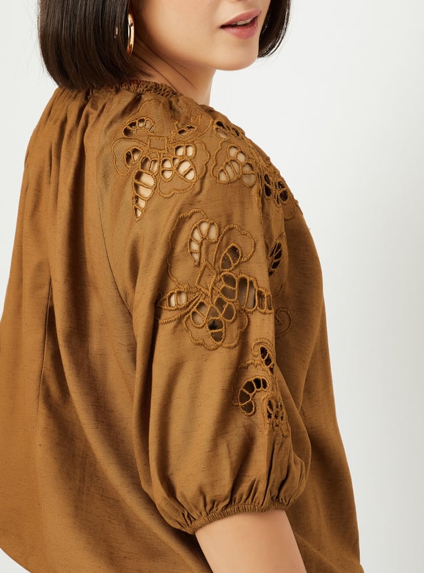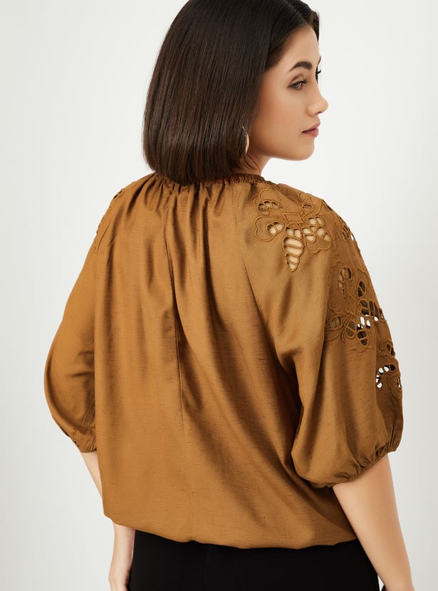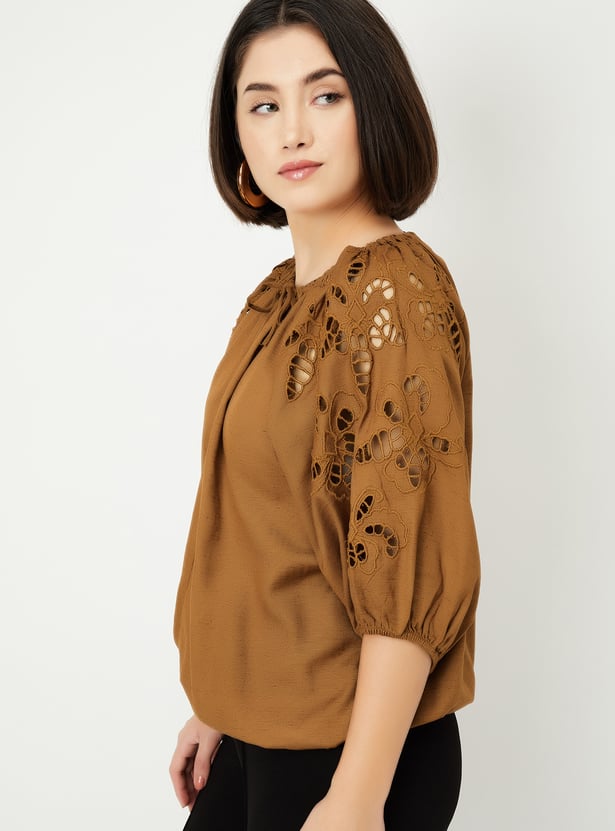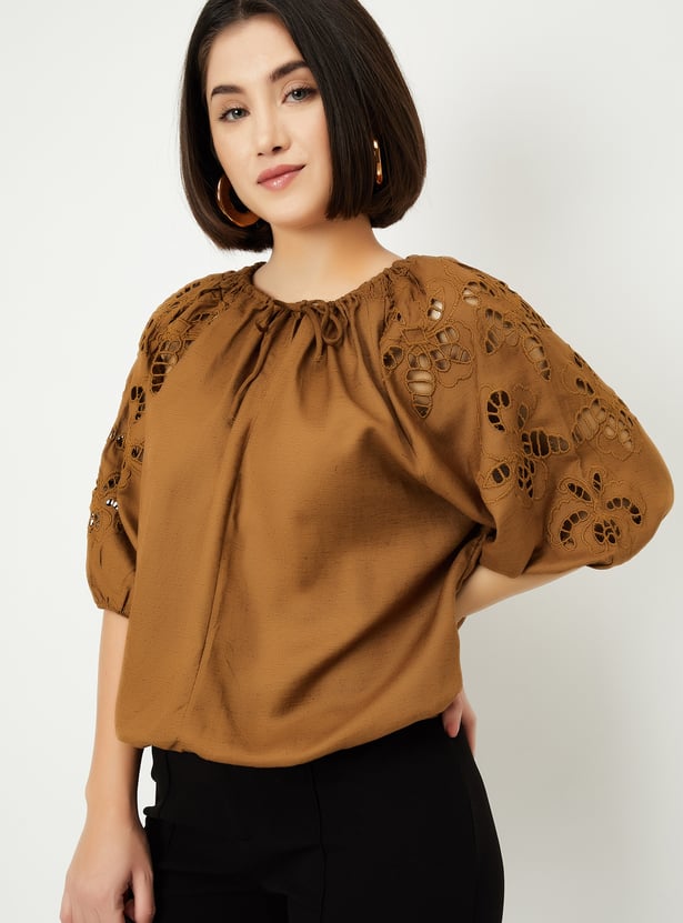 This solid top is the perfect mix of casual and chic, featuring peasant sleeves and a stylish tie-up neck. The cut-out detail on the sleeves adds a trendy twist to the classic design, making it your go-to for effortless style.