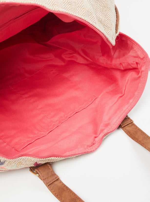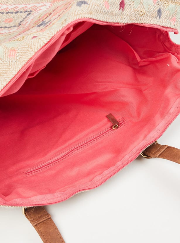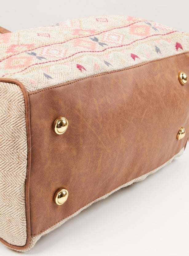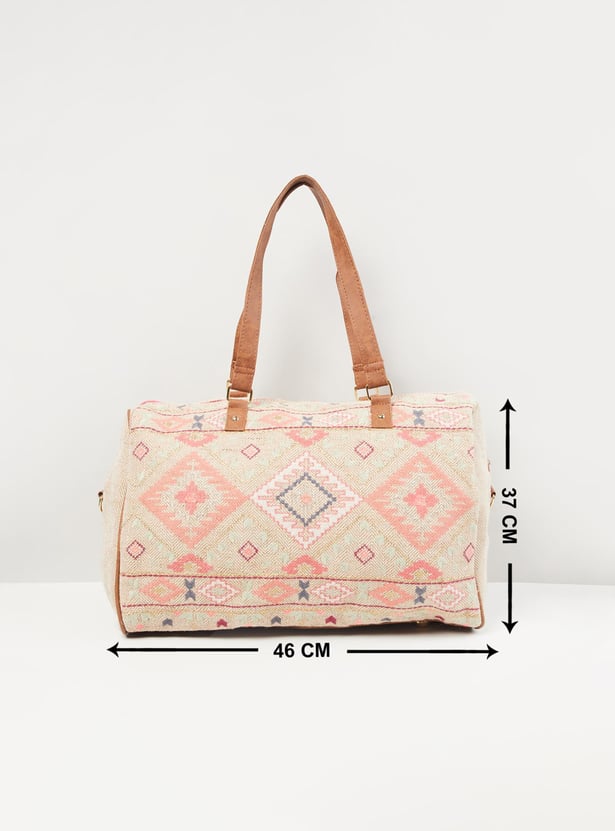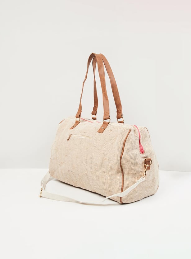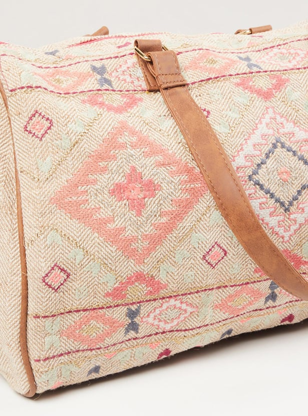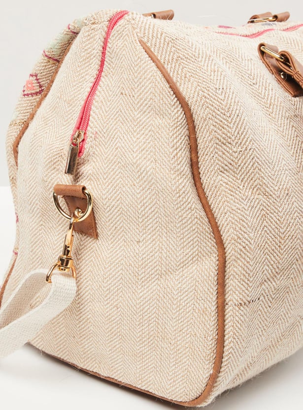Attractive embroidery accentuates the style of this weekender bag that comes with two flat carry handles and a detachable shoulder strap. The zippered main compartment comes with a zip pocket and slip pockets to keep all your essentials within reach.