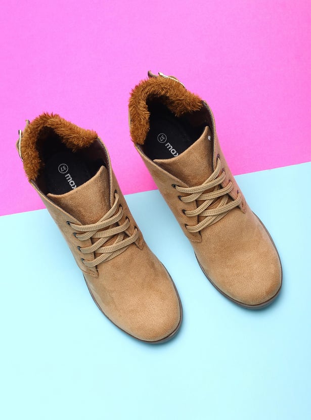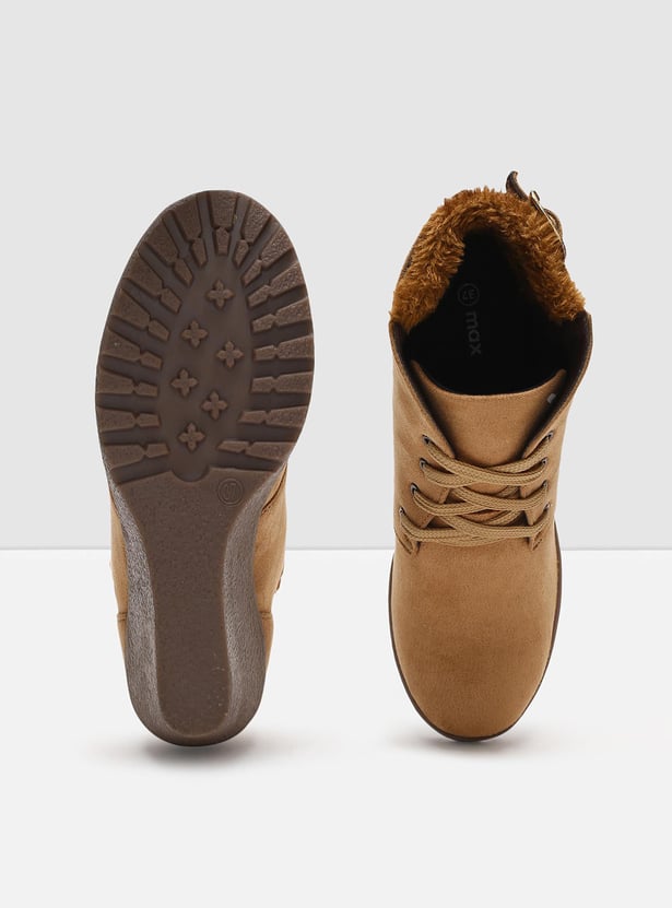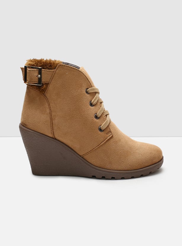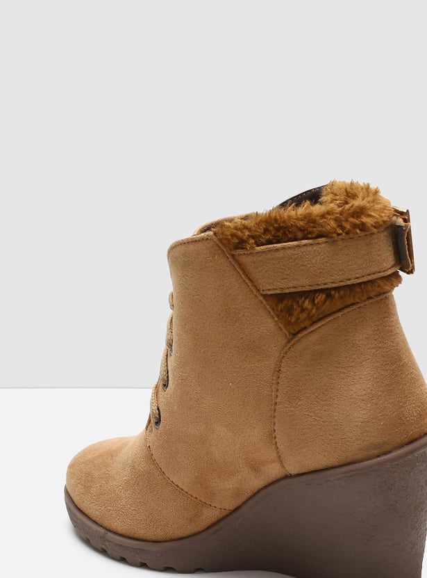 Crafted to impress, this pair of solid boots is an absolute love for your footwear fashion. It is amped up with lace-up closure, wedge heels, and amazing comfortable wear.