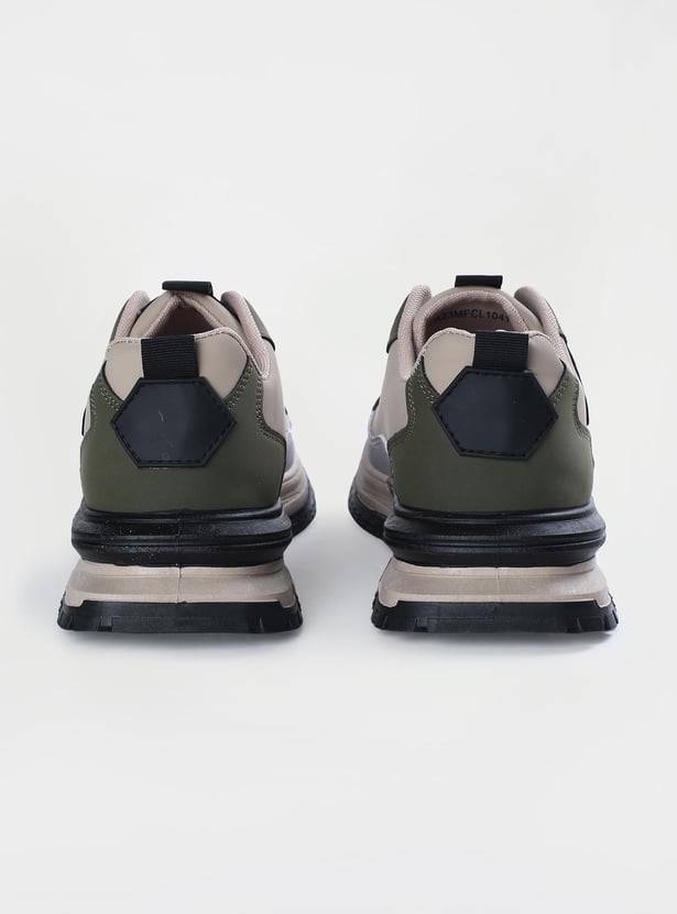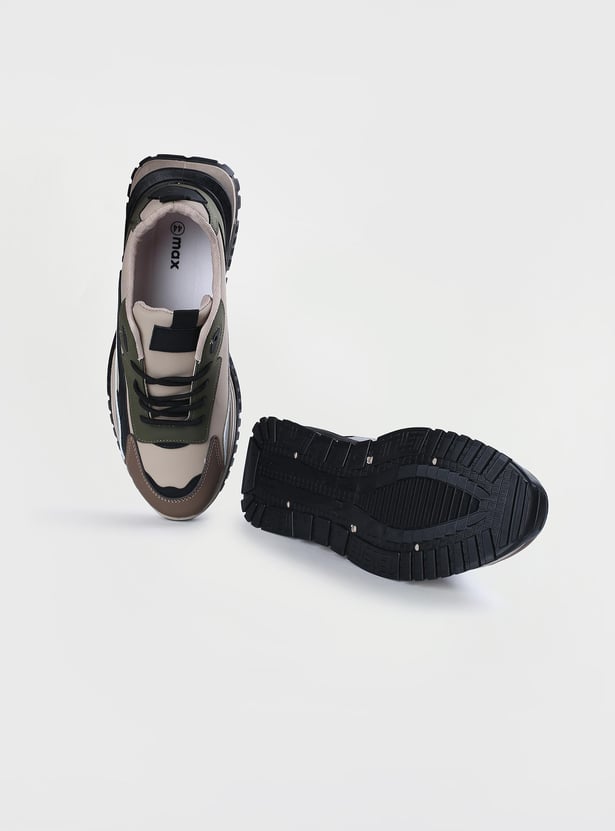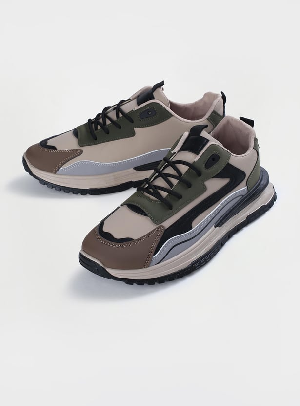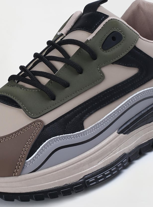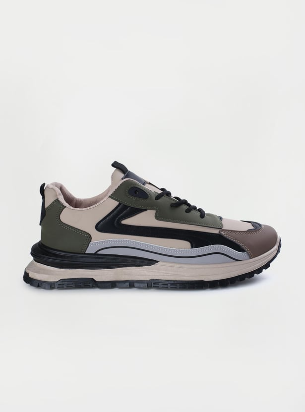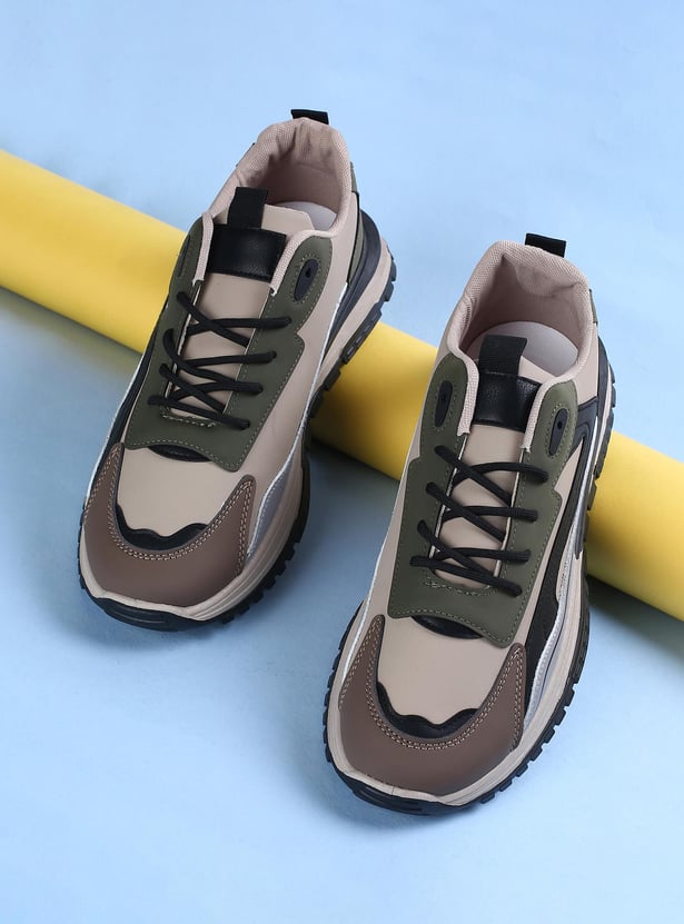 Lean on the sporty side with this pair of sneakers. It has a colourblock upper, round-toe design, lace-up closure, padded footbed, and traded outsole for improved traction.