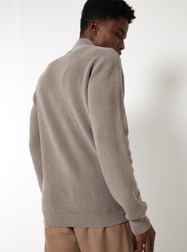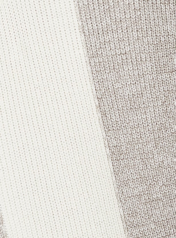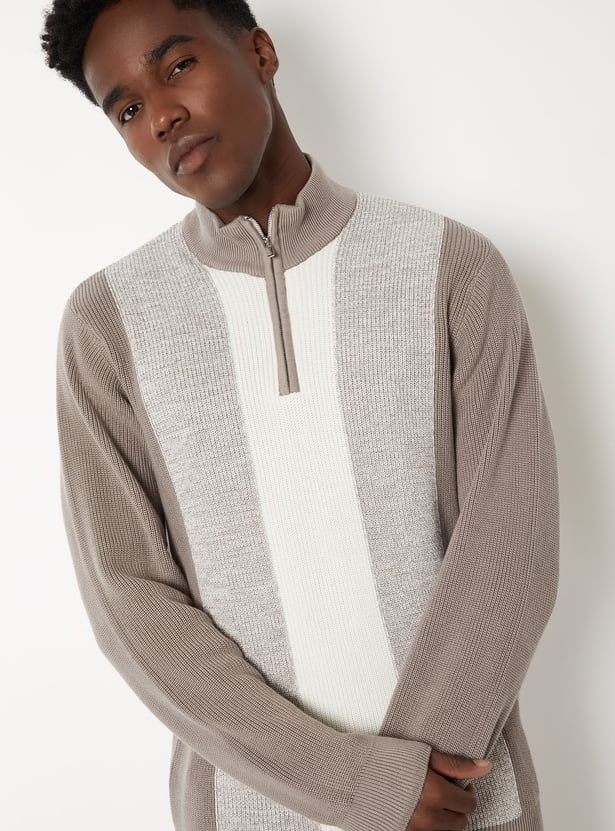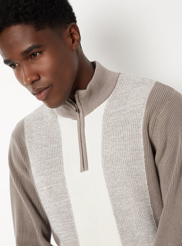 Stay warm in style with this colourblock sweater, featuring a high neck, zip closure, full sleeves, and a ribbed hem for a snug fit. The bold colourblock design adds a modern twist to your winter essentials.