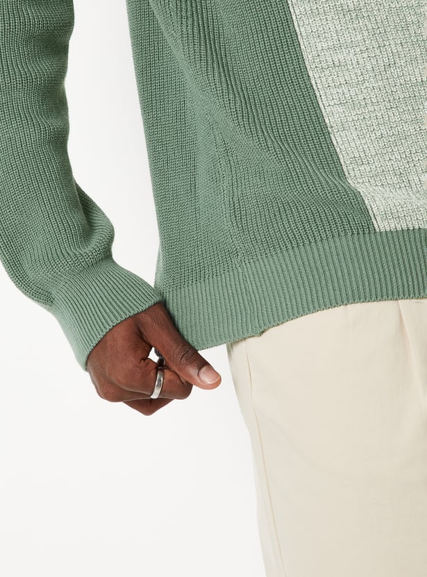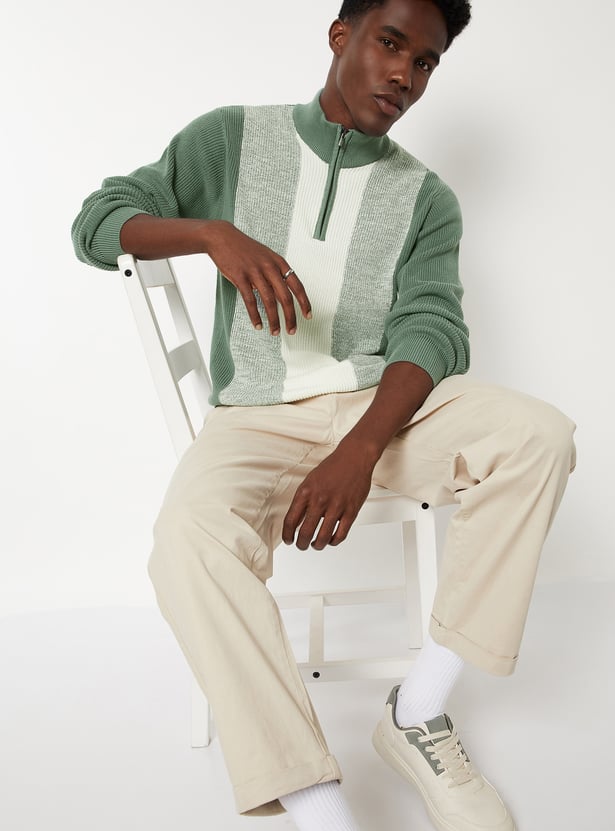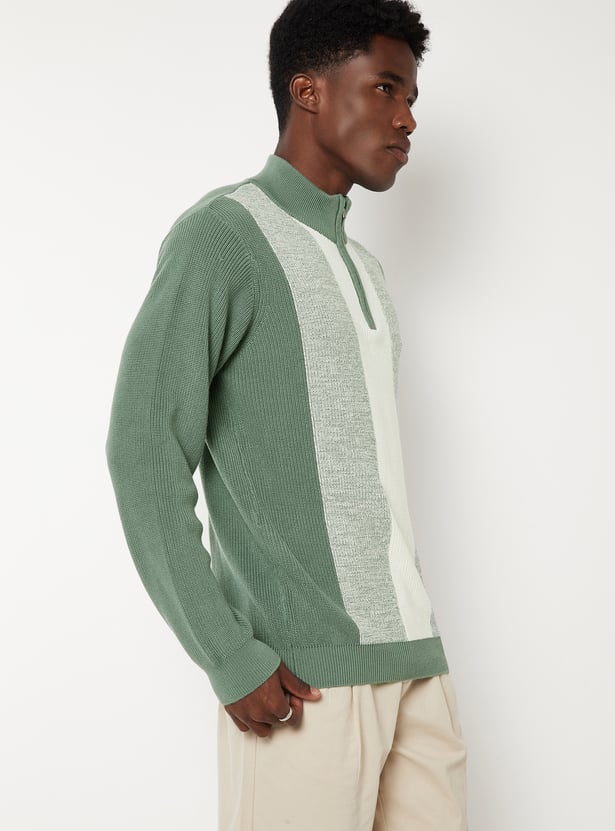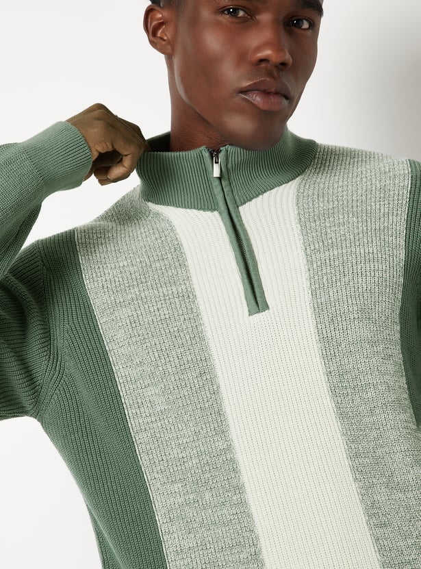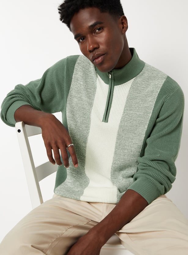 Stay warm in style with this colourblock sweater, featuring a high neck, zip closure, full sleeves, and a ribbed hem for a snug fit. The bold colourblock design adds a modern twist to your winter essentials.