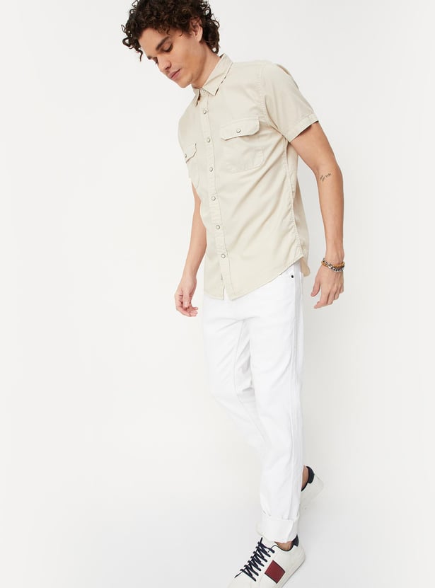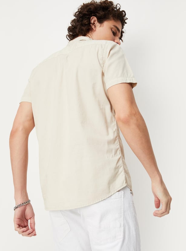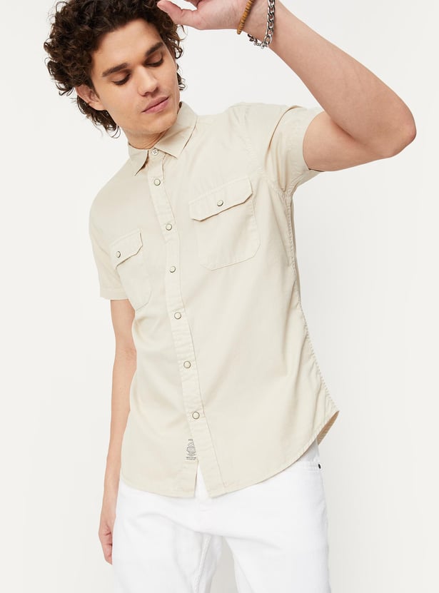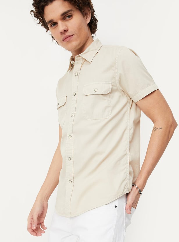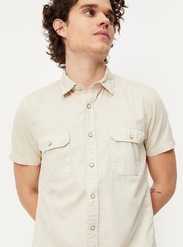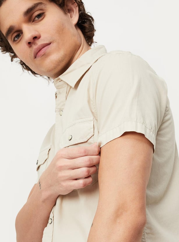 Sharpen your off-duty looks with this shirt that is crafted in a slim fit profile and rendered in a garment-dyed finish. It features a spread collar, short sleeves, double flap pockets, and a curved hem. Pair this shirt with trousers and sneakers to ace the look.