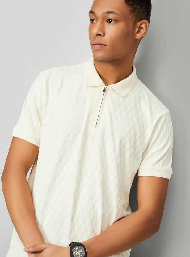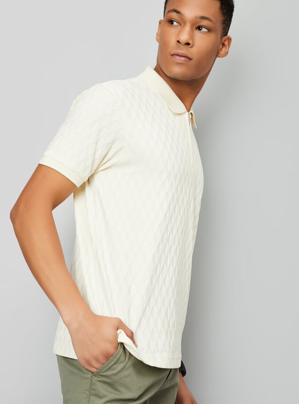 This T-shirt strikes the perfect balance of style and comfort. Featuring a classic polo collar, half sleeves, and a unique knit pattern, it adds a touch of sophistication to your casual wardrobe. The zip closure and side slits enhance the design, offering a modern twist and added ease of movement.