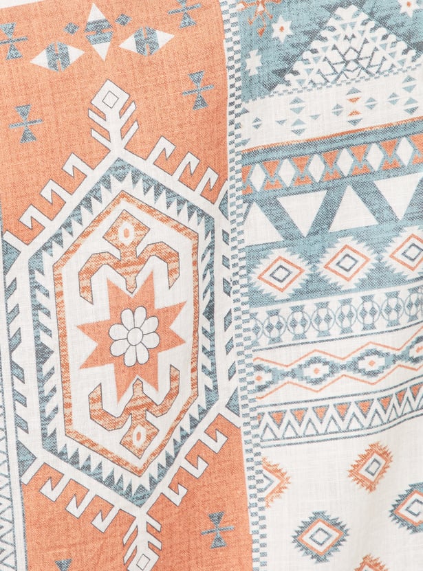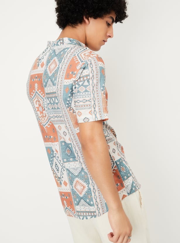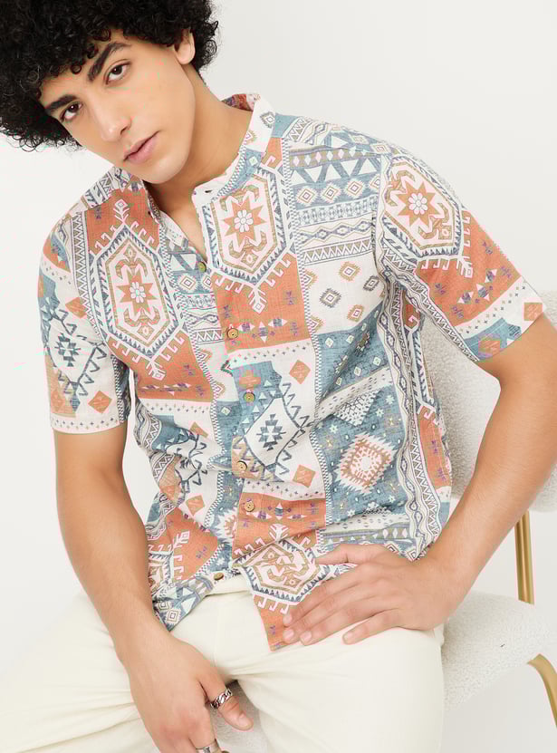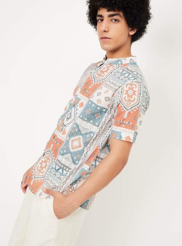 Elevate your ethnic style with this short kurta, designed to modernize your fusion wardrobe. It features a printed surface, a band collar, half sleeves a button placket, and a curved hem.