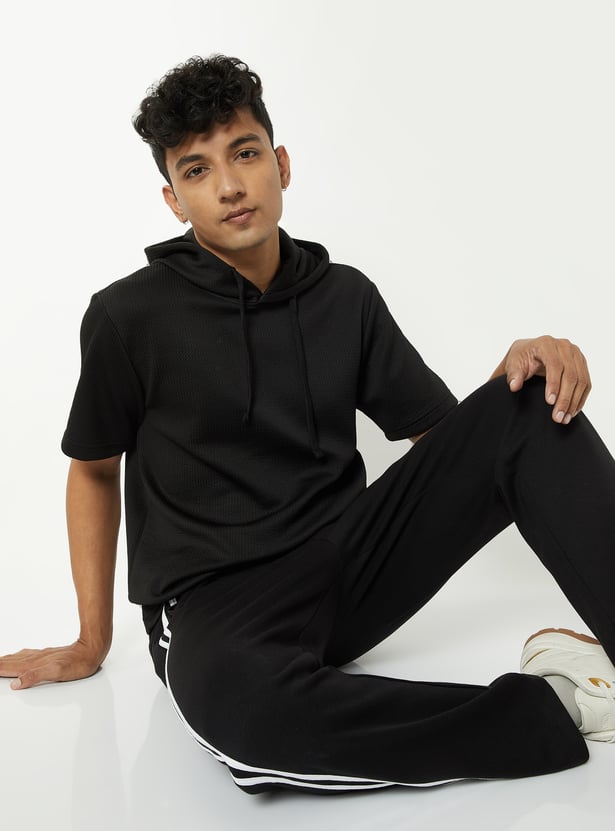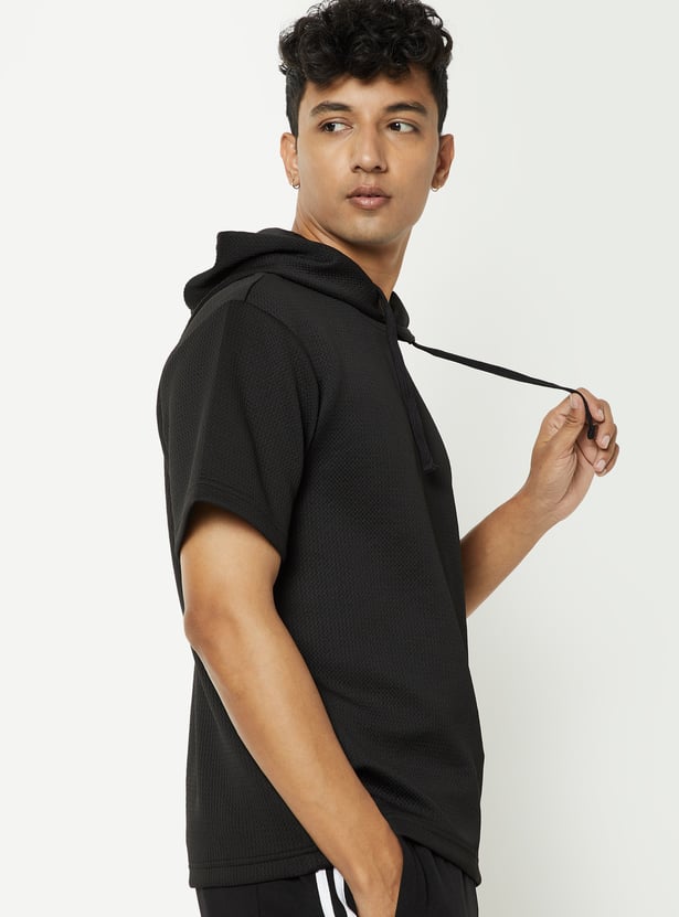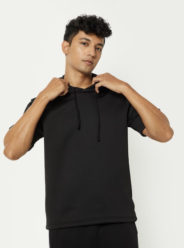 Stay active in style with this ribbed hooded sports T-shirt. Designed with a comfortable ribbed texture, it features a functional drawcord at the hood and half sleeves for ease of movement.