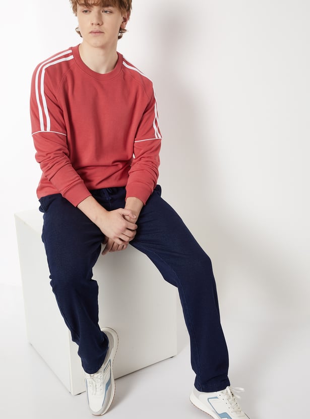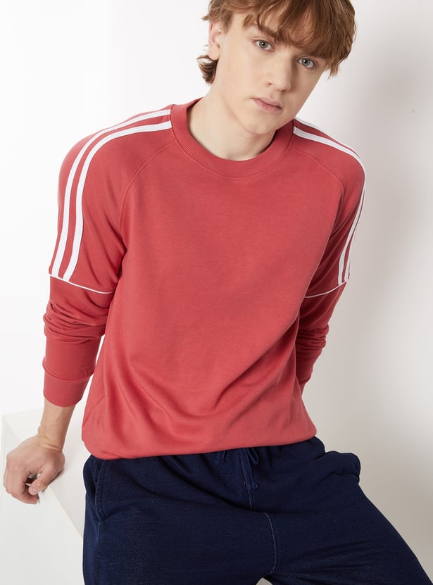 Add a sporty edge to your look with this side striped sweatshirt, featuring a classic crew neck and full sleeves. Comfortable and versatile, it’s perfect for everyday wear.