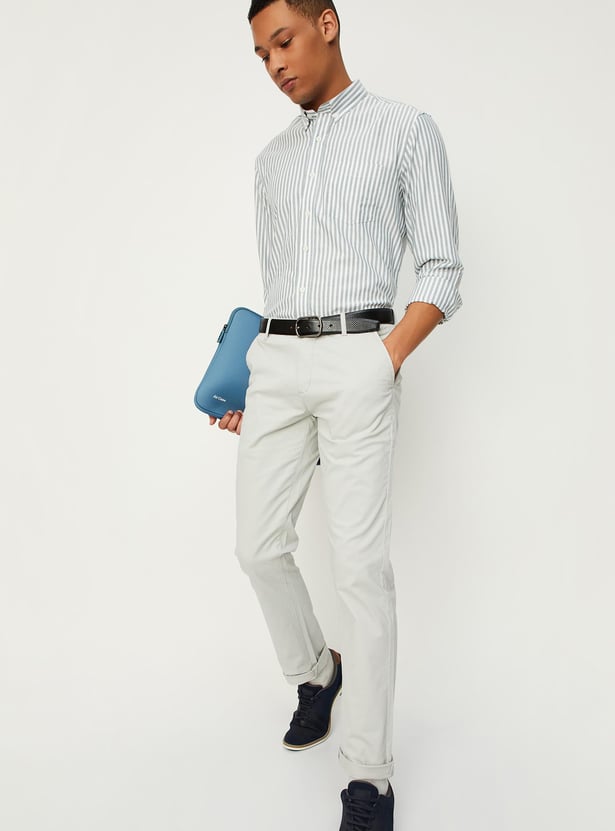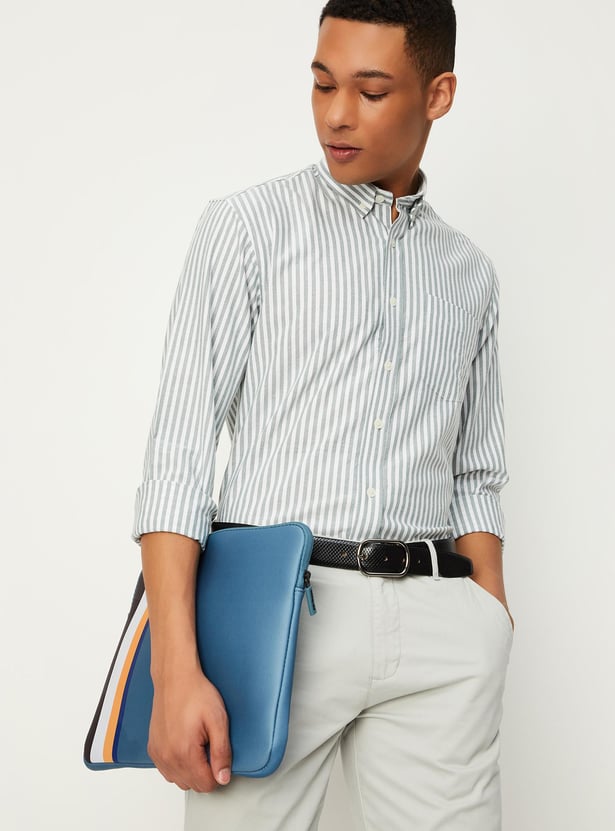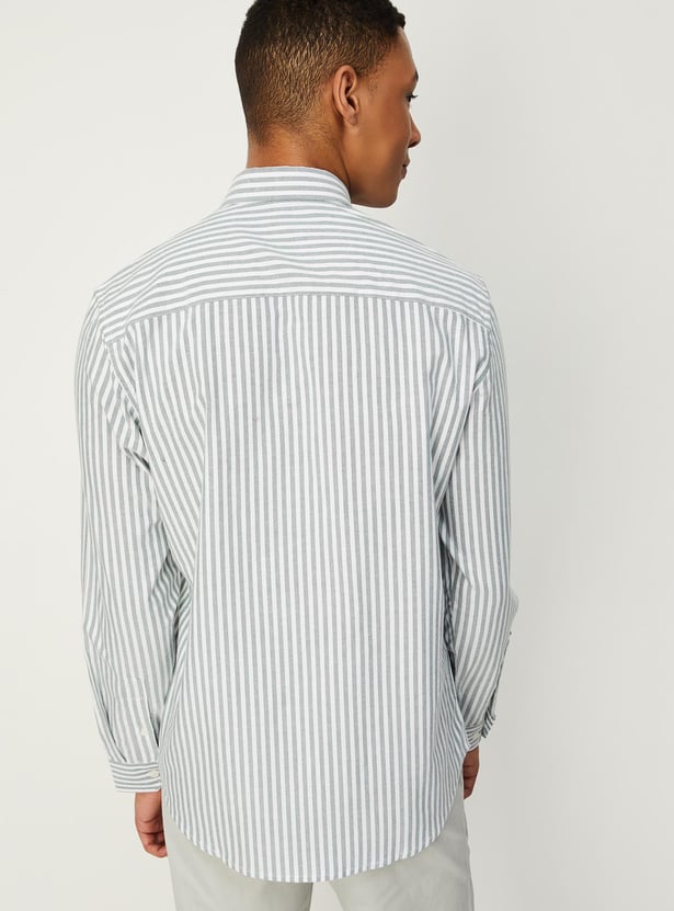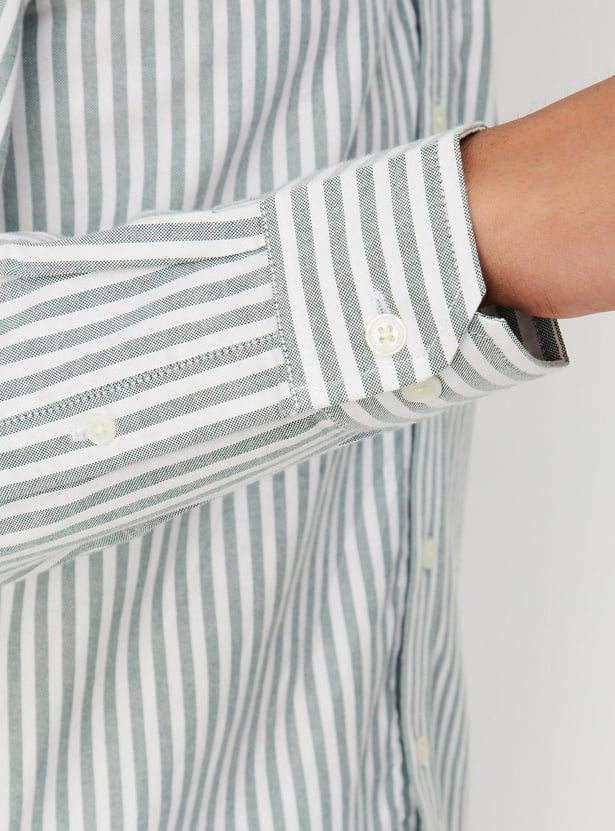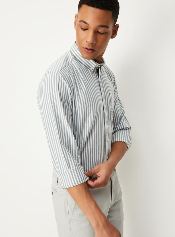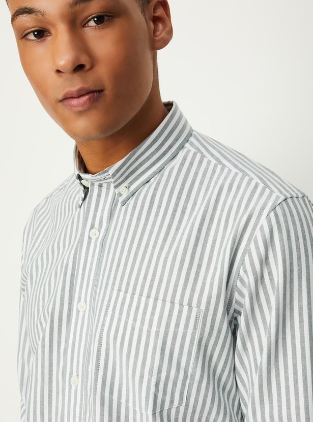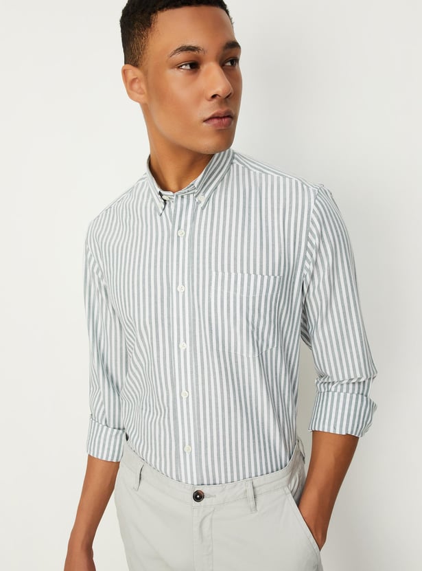 Smarten your style with this striped shirt. Styled with a button-down collar, this shirt has full sleeves, a button placket, and a patch pocket at the chest. It's easy to pair with chinos and oxfords for a sharp look.