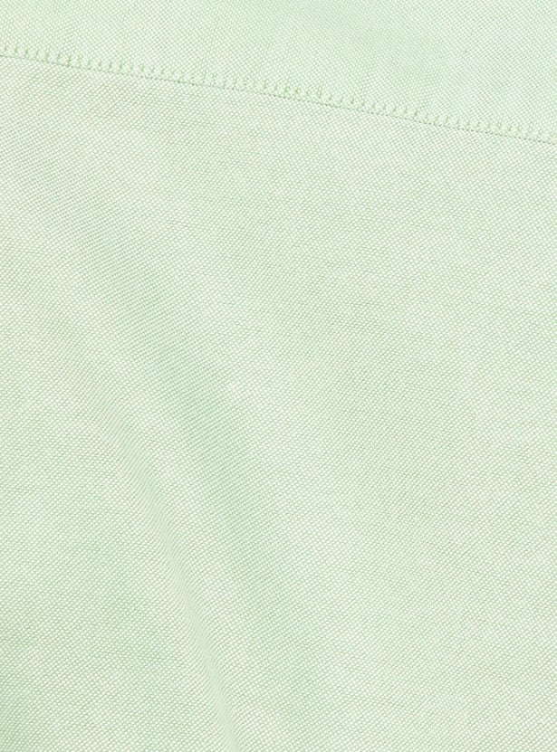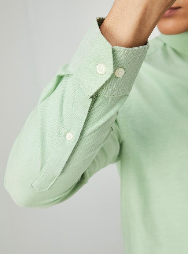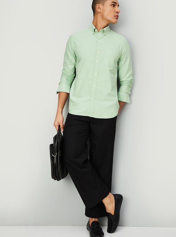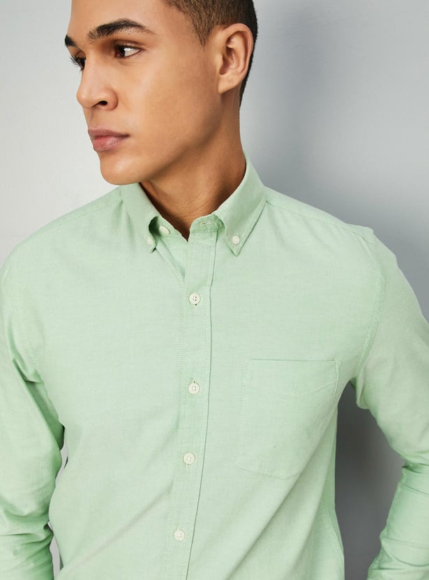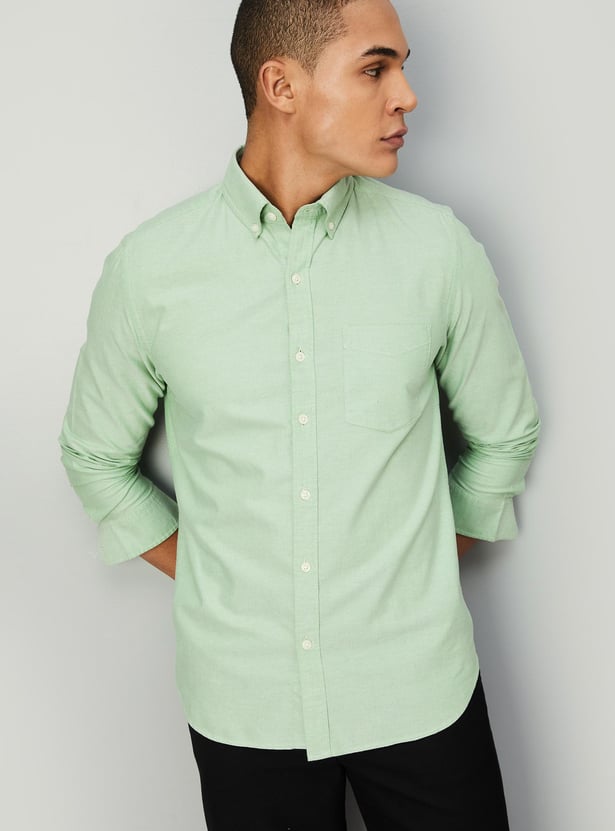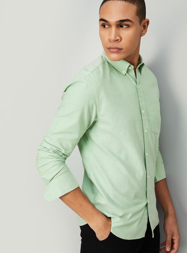 Infuse your wardrobe with sophistication and versatility by adding this solid shirt, complete with a button-down collar, full sleeves with buttoned cuffs, a curved hemline, a patch pocket, and a button-down front, offering a monochromatic design that effortlessly transitions between both formal and casual occasions.