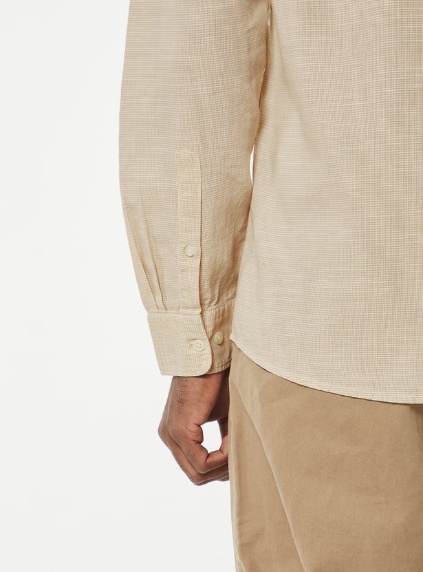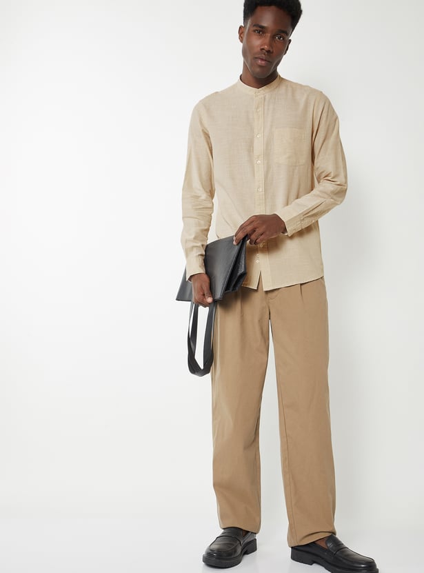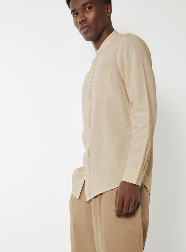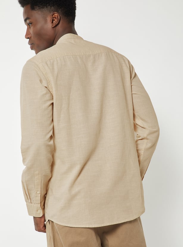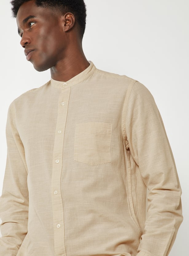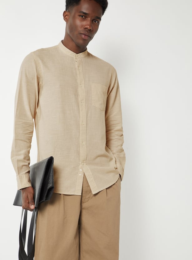 A solid shirt featuring a smart band collar and a neat button placket. Designed with full sleeves and button cuffs, it also includes a practical patch pocket for everyday ease.