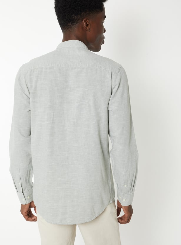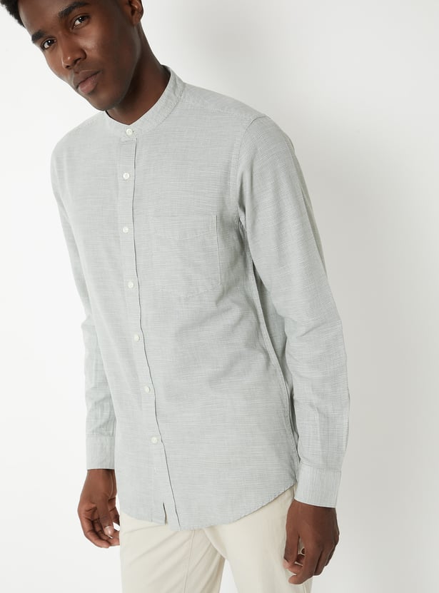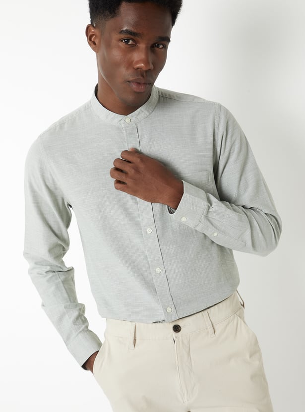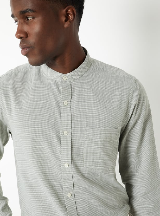 A solid shirt featuring a smart band collar and a neat button placket. Designed with full sleeves and button cuffs, it also includes a practical patch pocket for everyday ease.