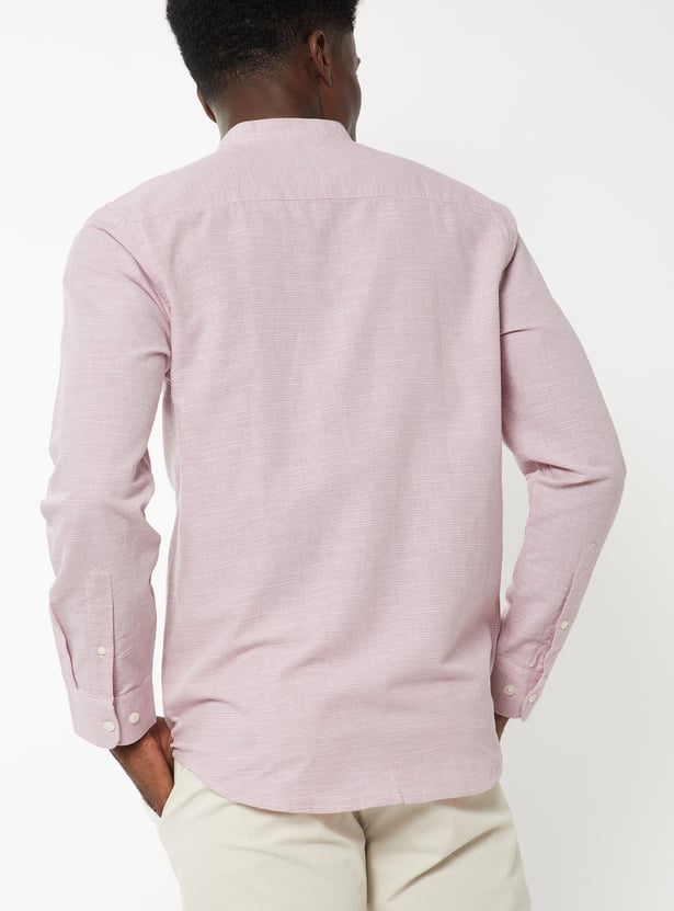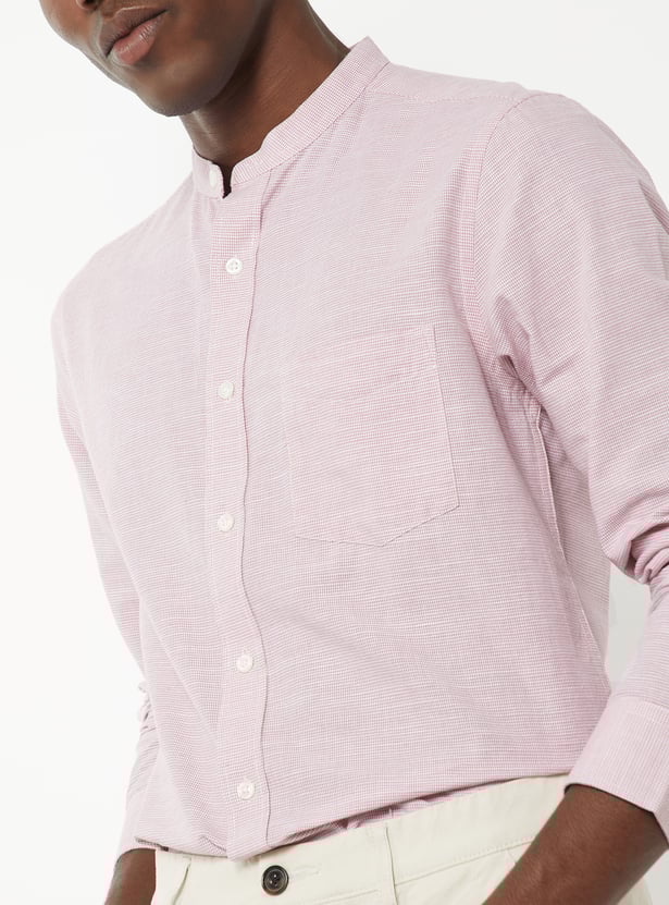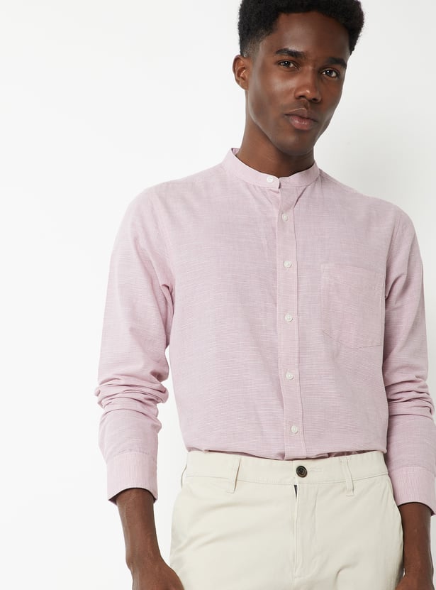 A solid shirt featuring a smart band collar and a neat button placket. Designed with full sleeves and button cuffs, it also includes a practical patch pocket for everyday ease.