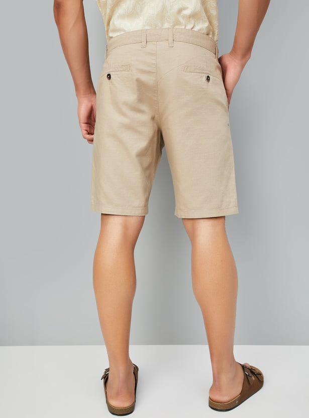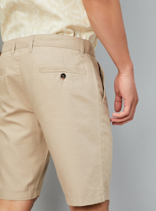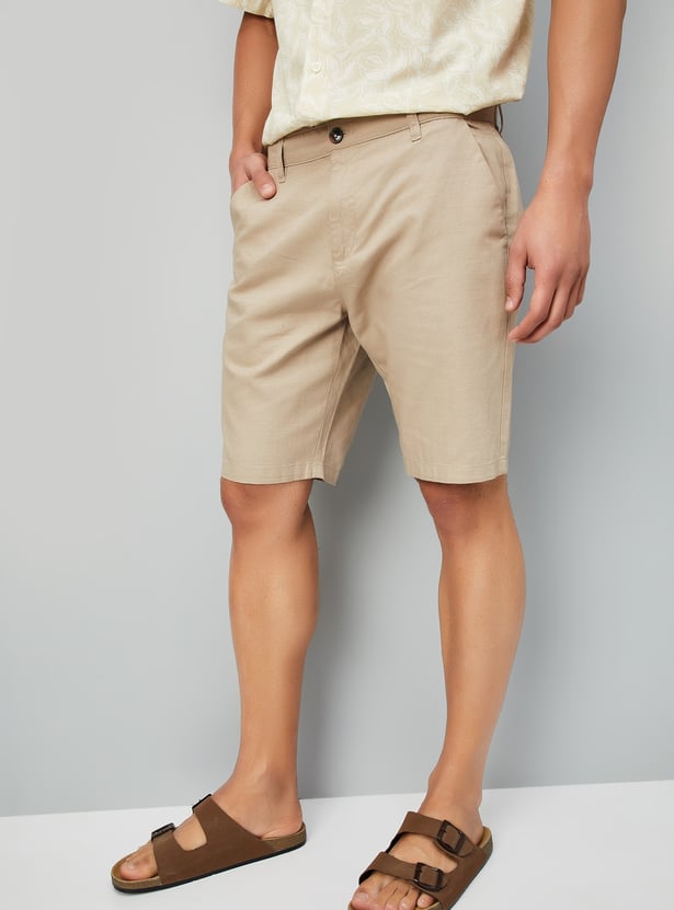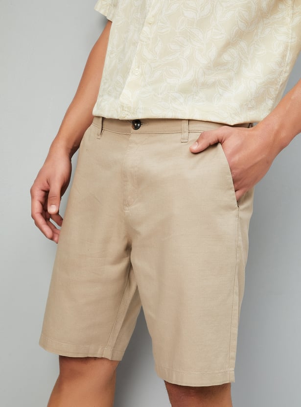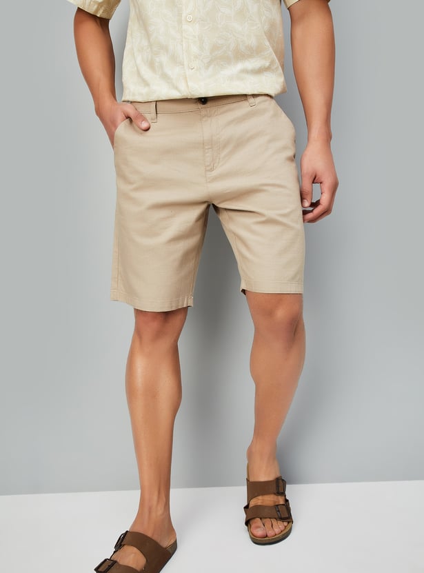 These solid regular fit shorts are a warm-weather essential, featuring a mid-rise waist for a comfortable fit. Designed with a button closure, belt loops, and four functional pockets for everyday convenience. A versatile pick for casual outings.